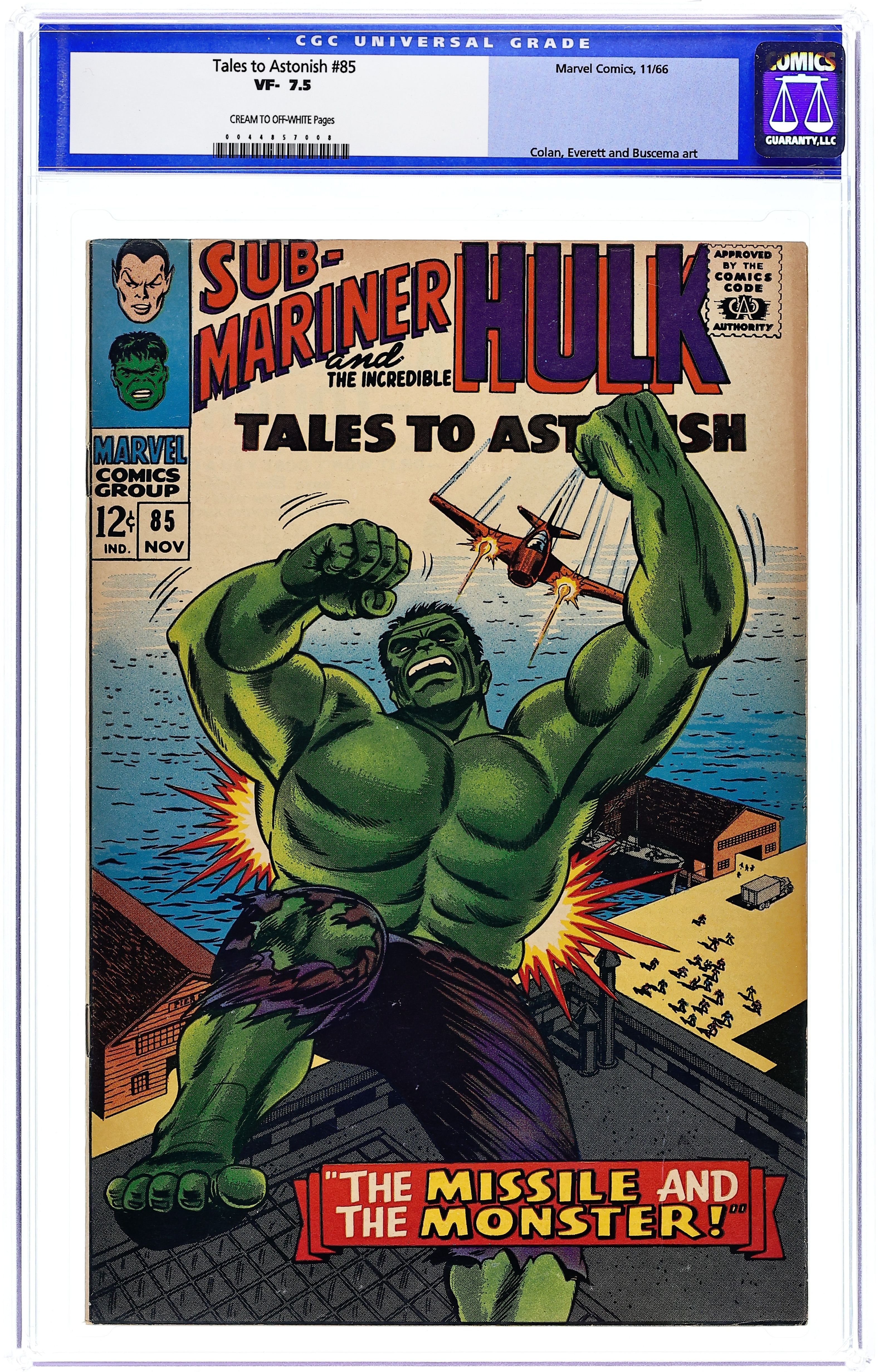 Starts Feb 16 Cover by Bill Everett. And One Shall Die, script by Stan Lee, art by Gene Colan and Bill Everett; Namor wanders around New York, completely ignoring the commands of the leader of the Secret Empire who is trying to get him to help in a battle with the incredible Hulk. The Missile and the Monster!, script by Stan Lee, art by John Buscema and John Tartaglione; When Ross activates the new Orion missile for a test, foreign spy Gorki activates a machine in the trunk of a car he commisioned Rick Jones to drive to New York and the missile changes course for the heart of the city; The Hulk intercepts the missile but changes to Banner before he can stop it. 36 pgs., full color. $0.12. Cover price $0.12.