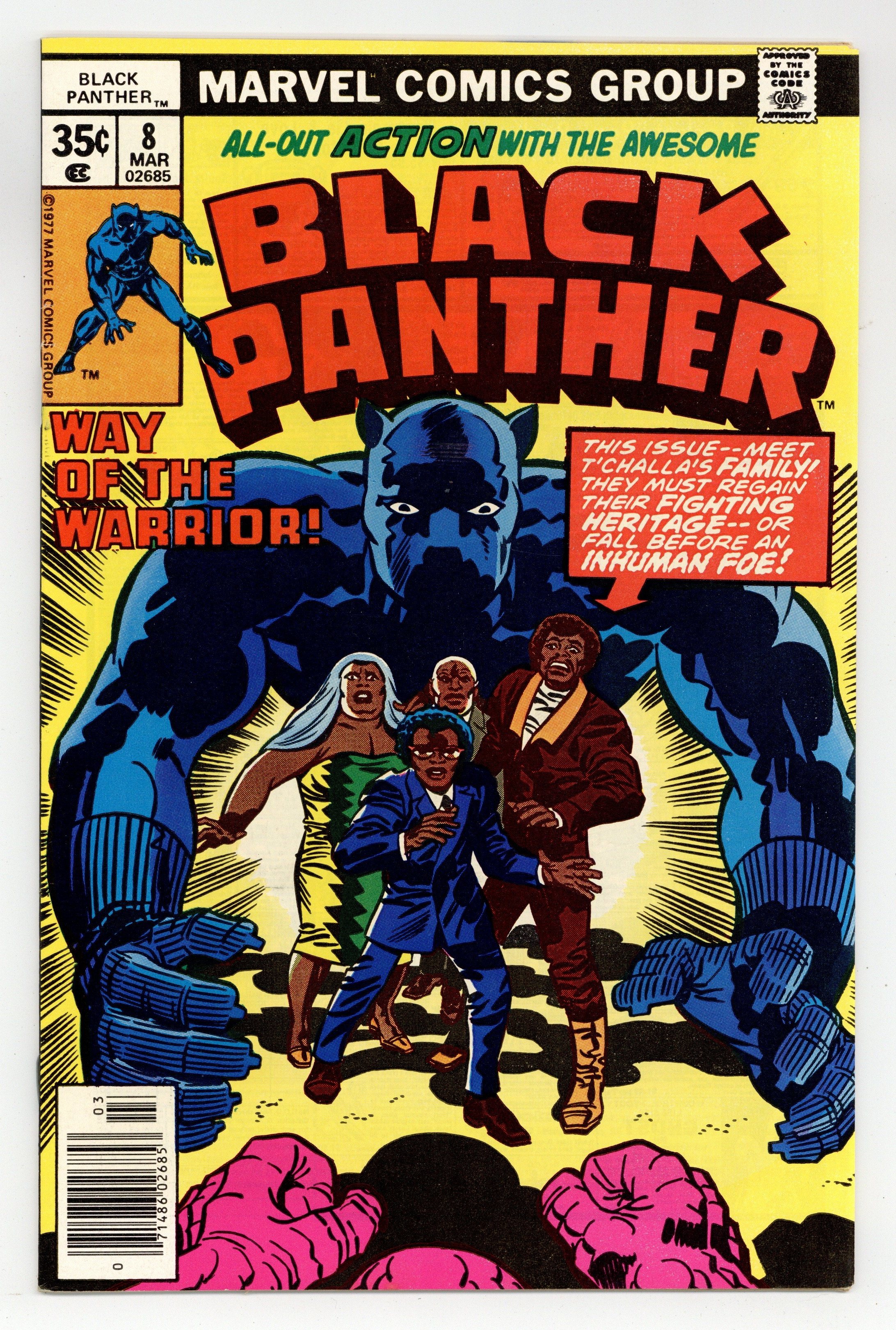 Starts Mar 2 Cover pencils by Jack Kirby, inks by Frank Giacoia. Panthers or Pussycats?, script and pencils by Jack Kirby, inks by Mike Royer; Traveling back to Wakanda, T'Challa recalls how he won the trial by combat to become the Black Panther, leader of the Panther cult and all of Wakanda; In Wakanda, members of the Wakandan royal family, Joshua Itobo, Ishanta, Khanata and Zuni, answer N'Gassi's call to battle the mutated Jakarra. 32 pgs. $0.35. Cover price $0.35.