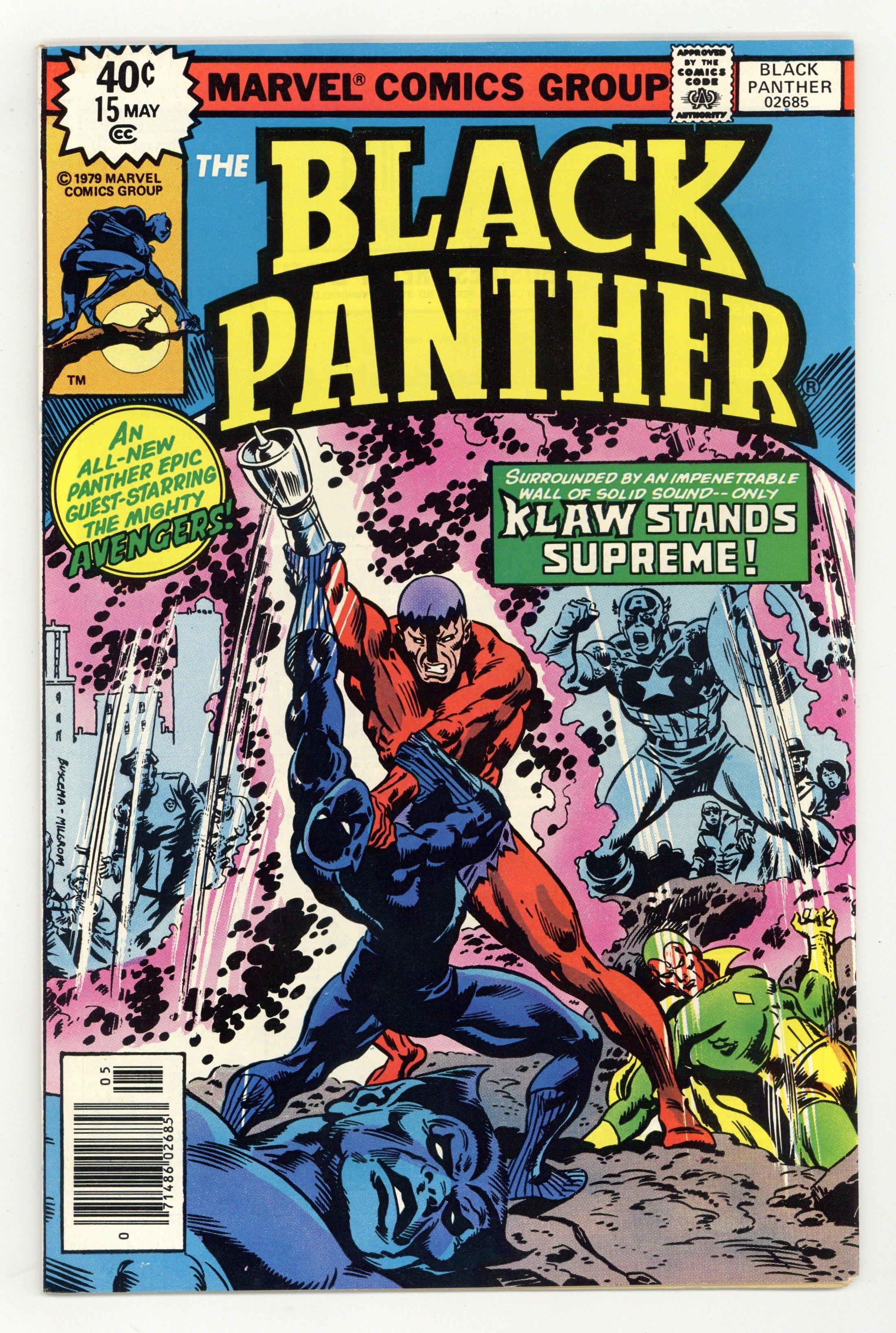 Starts Feb 23 "Revenge of the Black Panther! Part 2 of 2. Guest-starring the Avengers. Script by Ed Hannigan. Pencils by Jerry Bingham. Inks by Gene Day. Cover by John Buscema and Al Milgrom. Across New York City, Earths Mightiest Heroes are under attack from the master of sound! In Harlem TChalla and the star-spangled avenger battle a flying elephant, while the Beast and the Vision fight another sound creature on the west side waterfront! After Cap and the panther defeat the pesky pachyderm, the duo rushes to the docks to face Klaw himself! The Vision has kept Klaw in check so far, but now the Prince of Wakanda has to step up and save the day! Its the Black Panther vs. Klaw...to the fantastic finish! Final issue of the series. Cameo appearances by Monica Lynne and Windeagle. Avengers Lineup: Beast, Captain America, and the Vision. (Notes: Elements of the story continue in Marvel Premiere 51. Klaw returns in Marvel Two-in-One 57. Klaw previously battled Earths Mightiest Heroes in Avengers 126.) 32 pages Cover price $0.40.