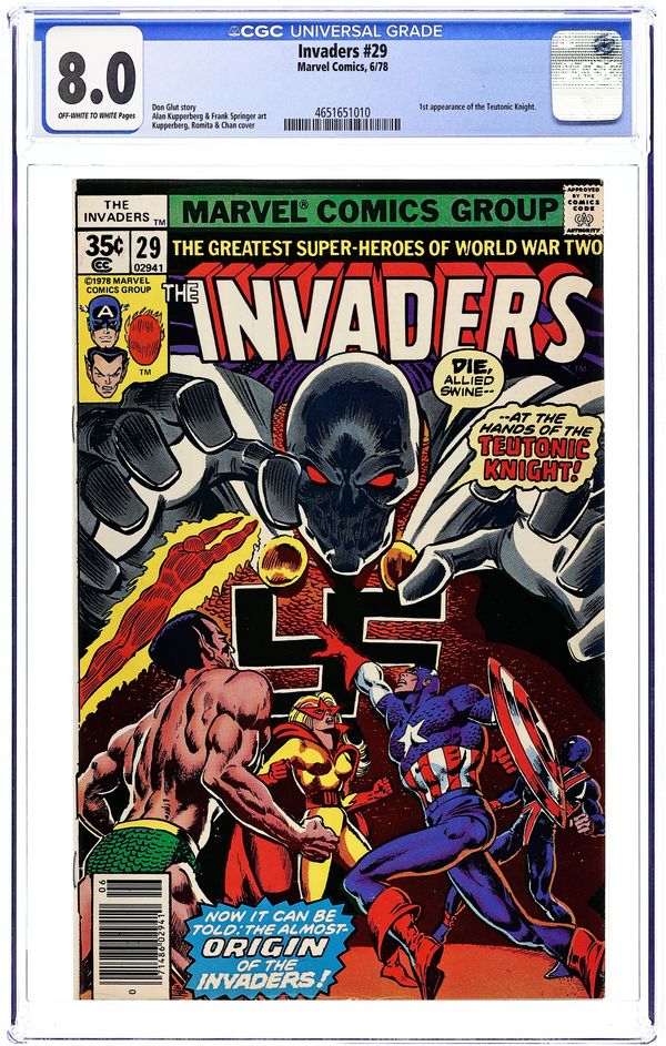 Part 2 of 2 - "Five Against the Flying Death!" Written by Don Glut. Art by Alan Kupperberg and Frank Springer. The Invaders are all that stands between the United Kingdom and the sinister Teutonic Knight and Der Fliegentod, the flying Death Machine! 32 pages, FC. Cover price $0.35.