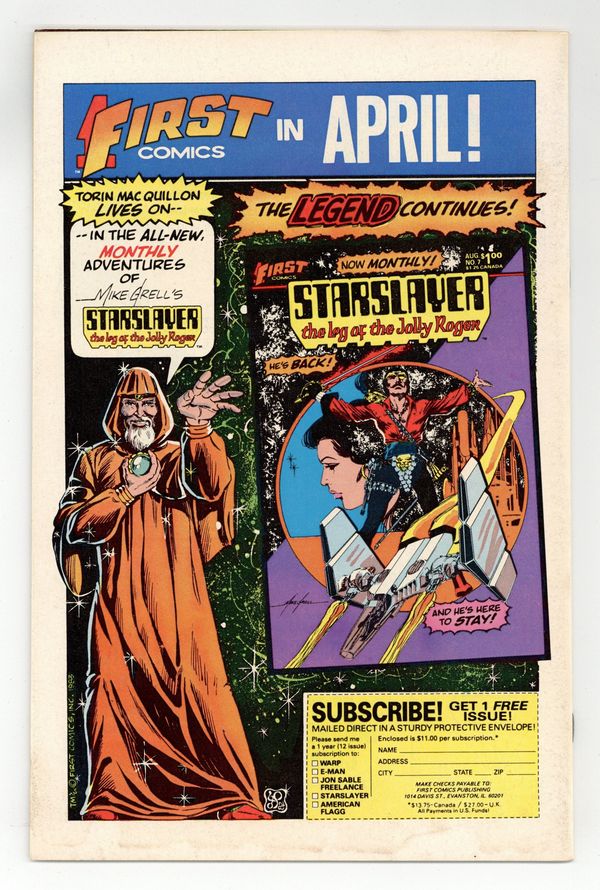 Starts Mar 23 Written and Illustrated by Mike Grell. Move over James Bond! Get out of the way Boba Fett! Make space Dr. Seuss?! It's Jon Sable, the best bounty hunter/secret agent in the world, and his "alter ego" B.B. Flemm, popular children's book author. Intrigue, espionage, and good ol' fashioned punch 'em in the mouth action abound in this series by noted Jack of all trades, Mike Grell. In this issue: "The Iron Monster!" When a conspiracy to kill then President, Ronald Reagan, transpires, Ronnie himself takes matters into his own hands and hires Jon Sable. Turns out, the hired assasin is an old war buddy of Sable's who is every bit as good as he is. Will Sable be able to save the leader of the free world in time, or will it be bedtime for Bonzo? Cover price $1.00.