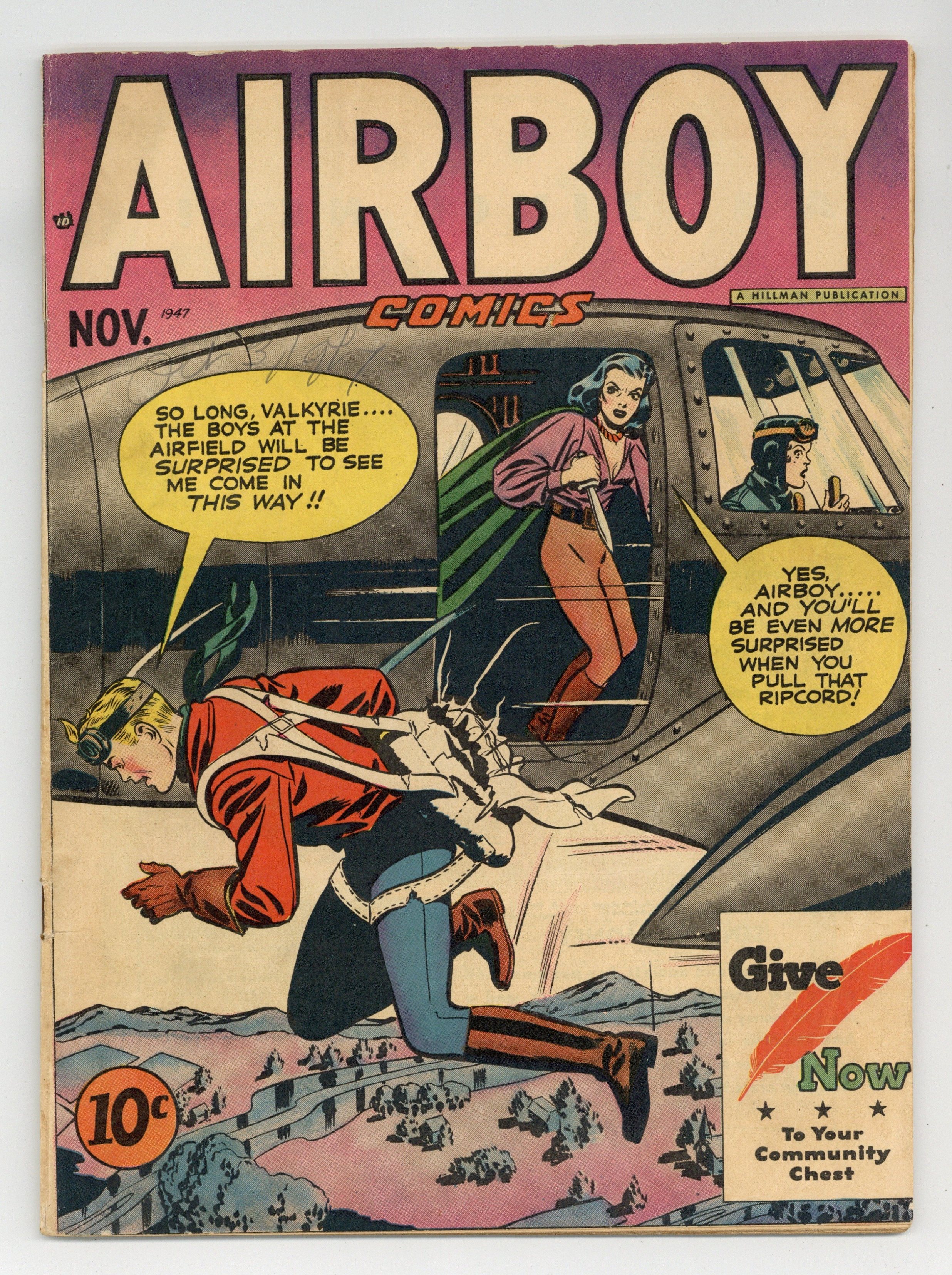 Starts Jan 19 Cover by Fred Kida. Stories and art by Dick Wood, Fred Kida, Tony DiPreta, and Dick Hall. One of the more fanciful and influential of 1940s aviator heroes, Airboy fights evil with his radio-controlled plane "Birdie" and its plethora of experimental flying tech. Sometimes listed as Airboy Comics #35. No issue # on cover; Vol. 3, issue #11 in indicia. When Airboy and Valkyrie are captured by mind-controlling atomic-powered medieval conqueror Black Tamerlane, only fellow Hillman air hero Sky Wolf can save them, in a rare crossover story. The Heap is pursued by a movie producer who sees it as the next great movie monster. Iron Ace investigates The Model Plane Murders. Airboy and Sky Wolf: The Wind of Battle; Skinny McGinty; The Heap: Nature's Prank!; No Trespassing!; Man By the Kitchen Door; Iron Ace. 52 pages, Full Color. Cover price $0.10.