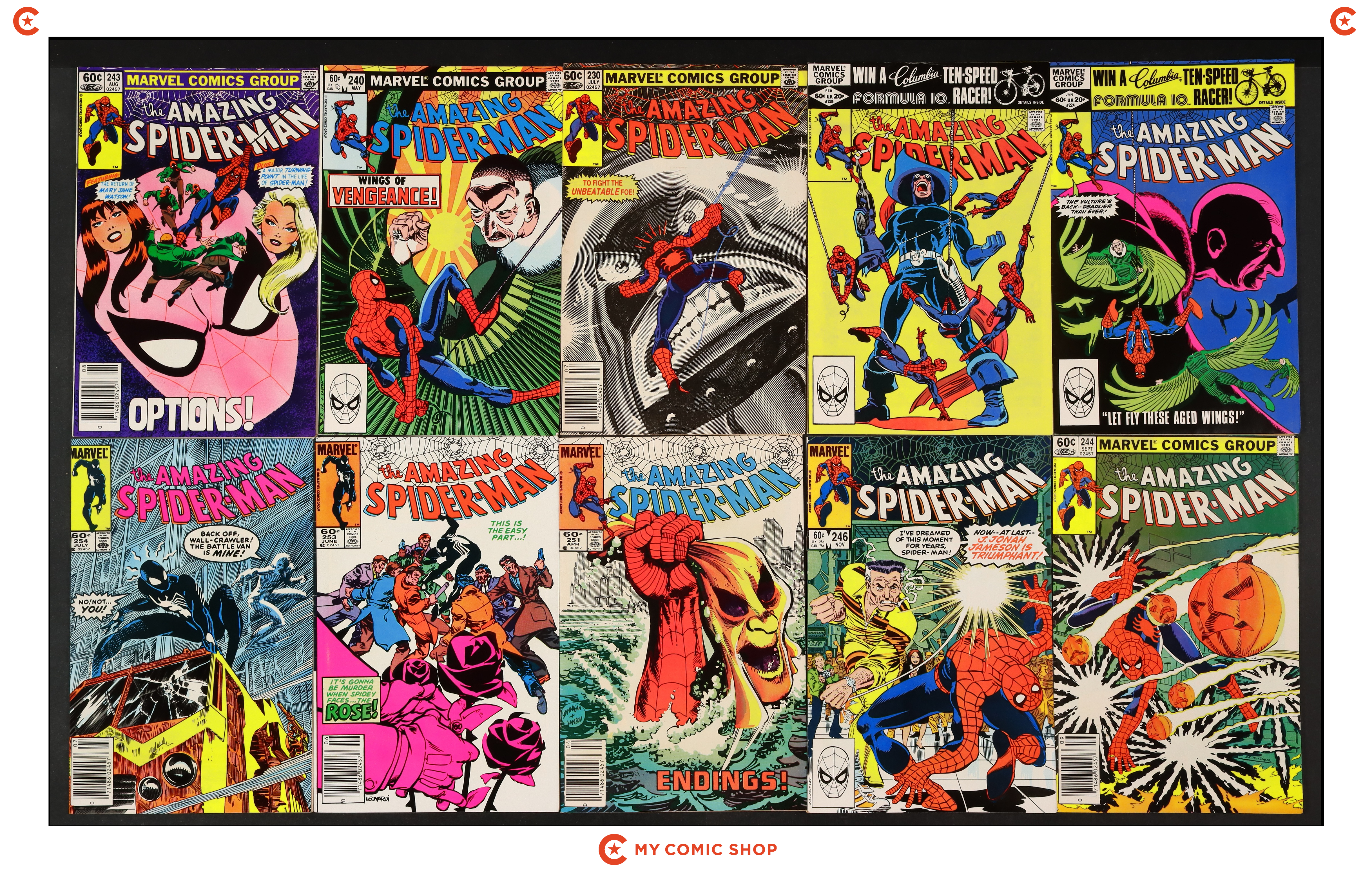 Issues 224, 225, 230N, 240, 243N, 244N, 246, 251N, 253N, and 254N of Amazing Spider-Man (1963 1st Series). Most will grade in the FN range with a couple grading VF.