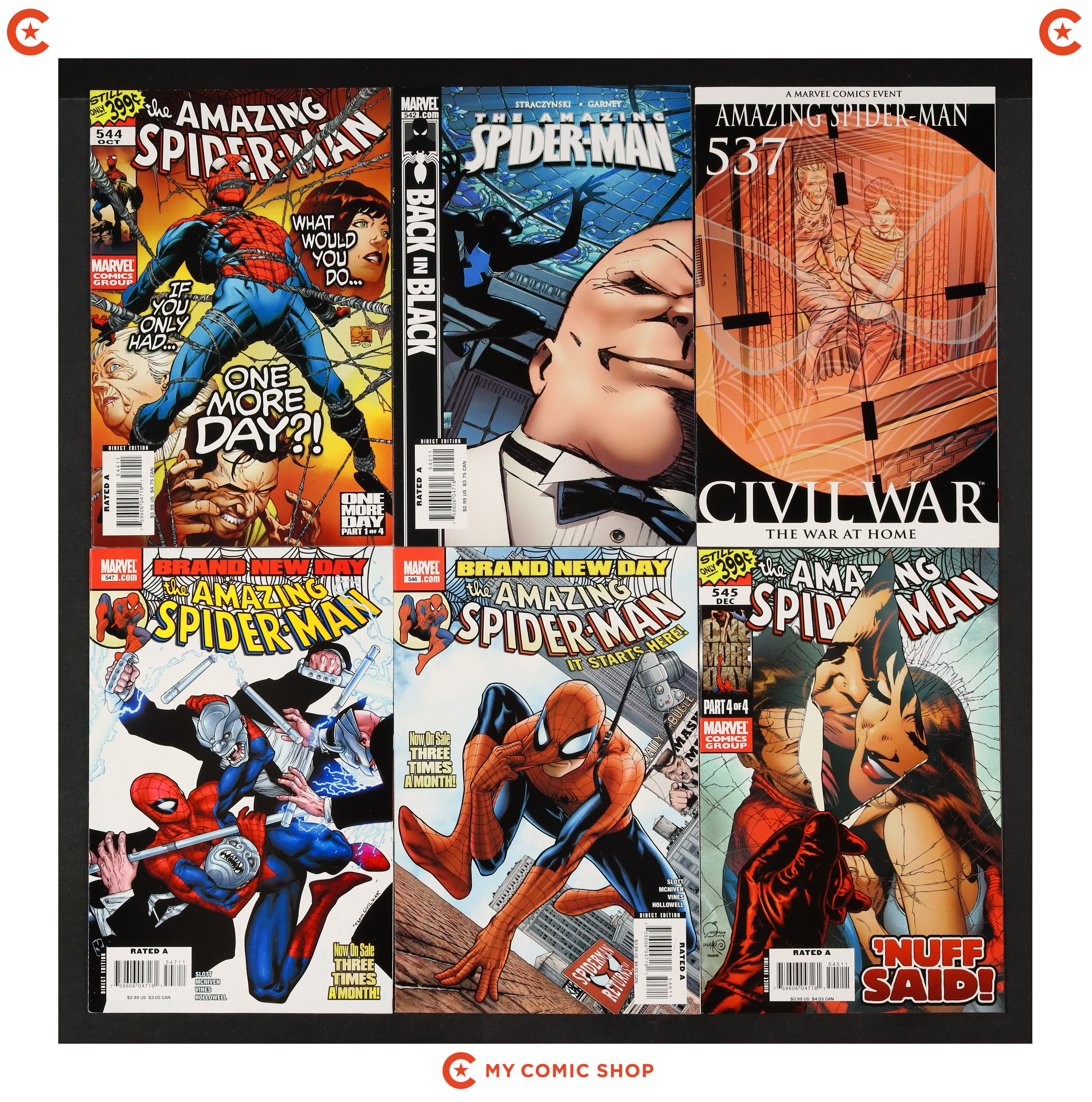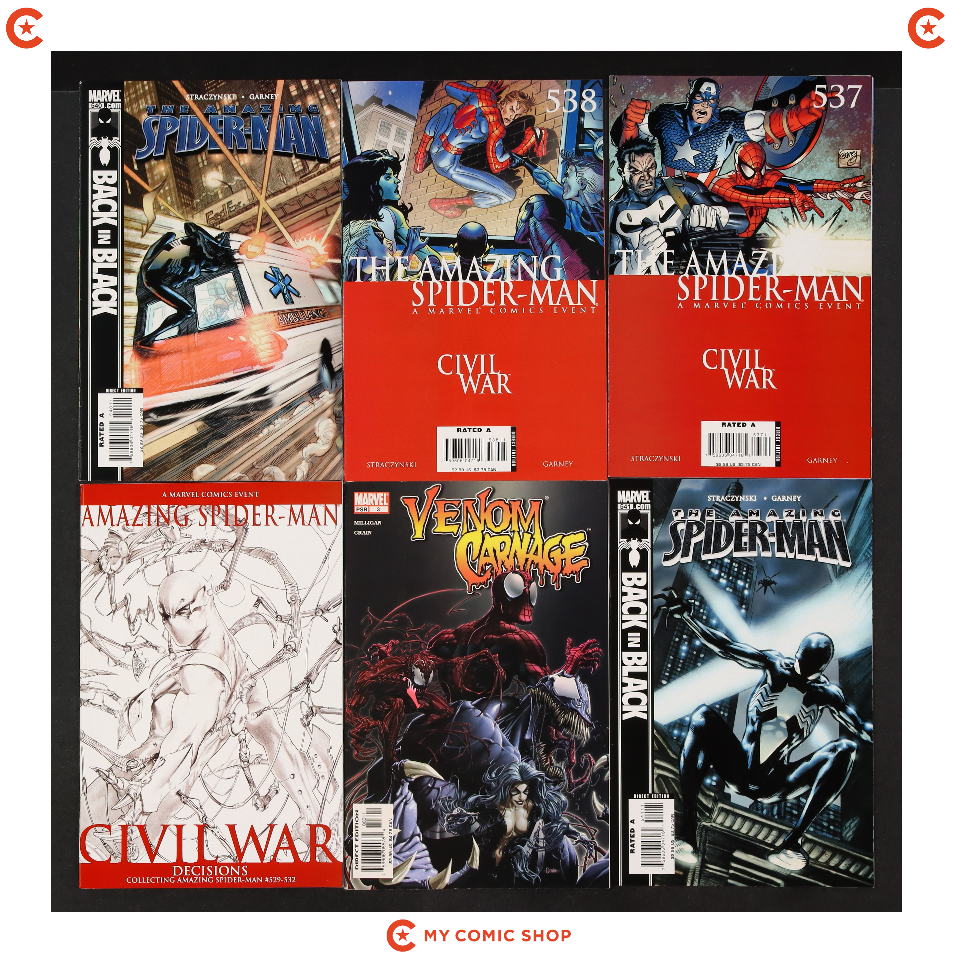 Issues 526A, 527A, 533A, 534-536, 537A, 538A, 540, 541 of Amazing Spider-Man (1998 2nd Series); Venom vs. Carnage (2004) 3; and Civil War Amazing Spider-Man Decisions (2006) 0. Most will grade in the VG/FN to FN/VF range.