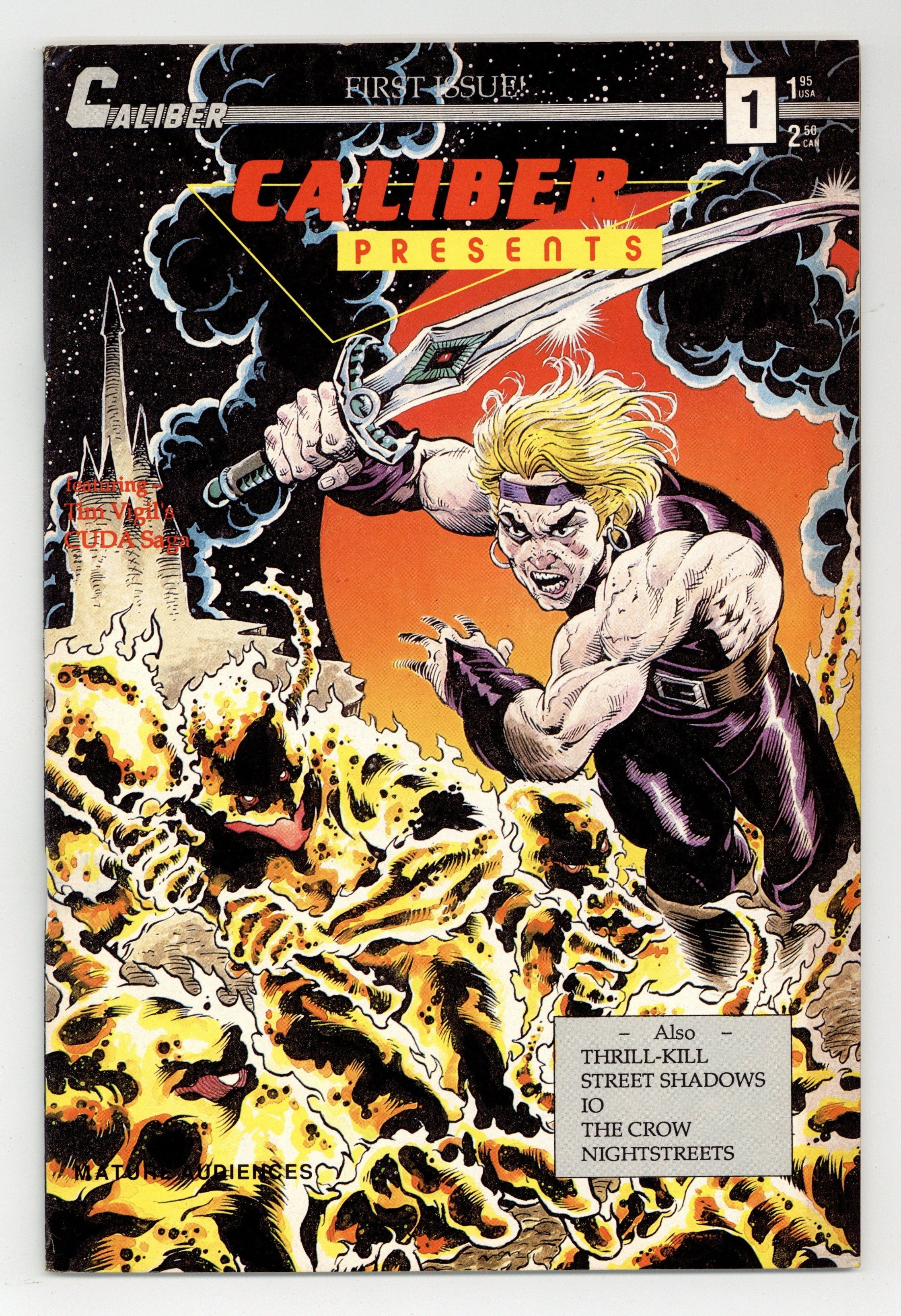 Starts Apr 4 1st appearance of The Crow. Cover by Tim Vigil. Stories and art by James OBarr, Mark Bloodworth, Tim Vigil, Mark Winfrey, Tim Tyler, and Kyle Garrett. Anthology featuring Caliber artists and characters, as well as stand-alone stories. The first-ever appearance of OBarrs The Crow in Inertia, plus another OBarr story, IO; the sword-and-sorcery strip Cuda; a preview of Bloodworths NightStreets series. 48 pages, B&W. Mature readers. Cover price $1.95.