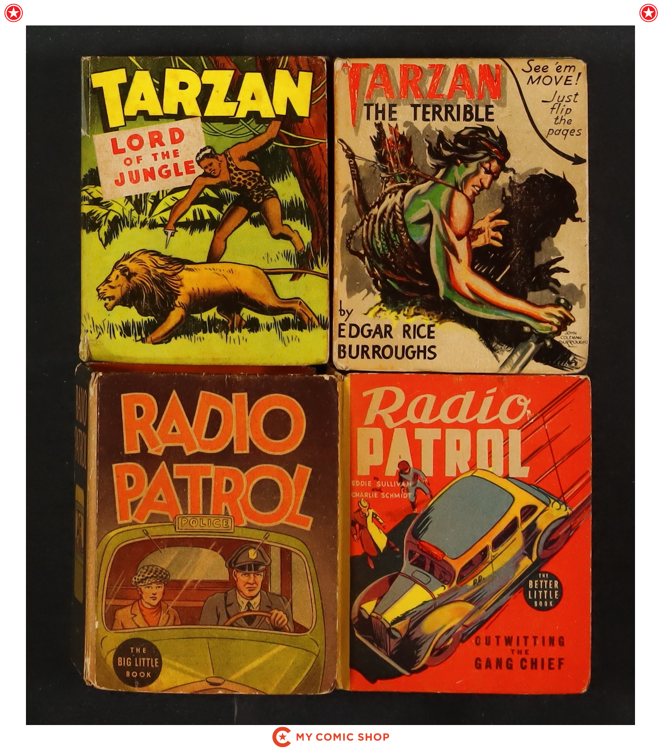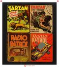 Issues 1496 of Radio Patrol Outwitting the Gang Chief (1939 Whitman BLB); 1142 of Radio Patrol (1935 Whitman BLB); 1407 of Tarzan Lord of the Jungle (1946 Whitman BLB_); and 1453 of Tarzan the Terrible (1942 Whitman BLB). Most will grade in the VG to GD range.