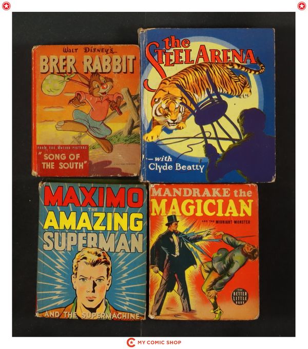 Issues 1431 of Mandrake the Magician and the Midnight Monster (1939 Whitman BLB); 1104 of Steel Arena (1936 Saalfield BLB); 1426 of Brer Rabbit (1947 Whitman BLB); 1445 of Maximo the Amazing Superman and the Supermachine (1941 Whitman BLB). Most will grade in the VG to GD/VG range.