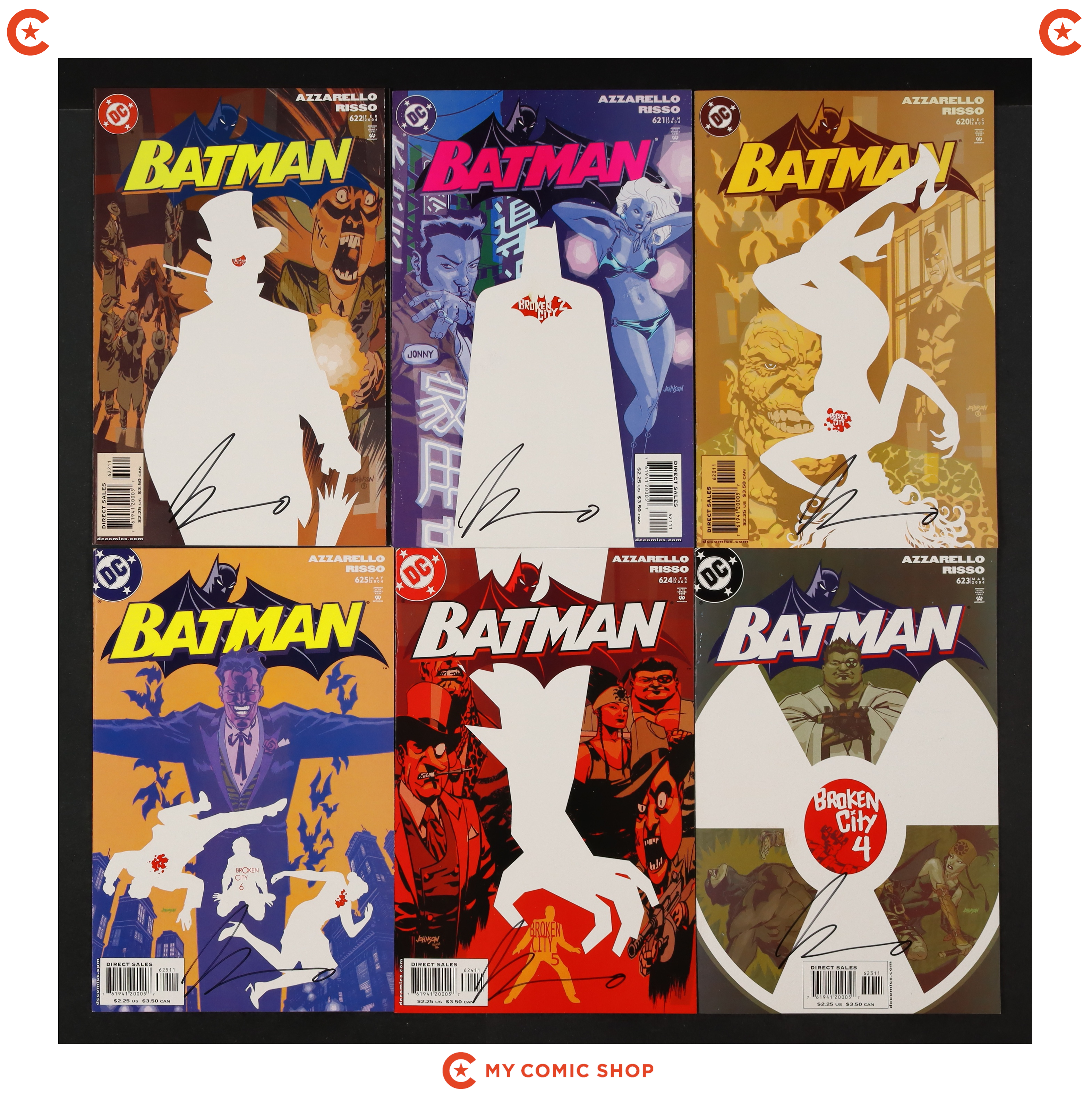 Issues 620-625 of Batman (1940) signed by Brian Azzarello. No autograph certification is included. Most will grade in the FN to VF range.