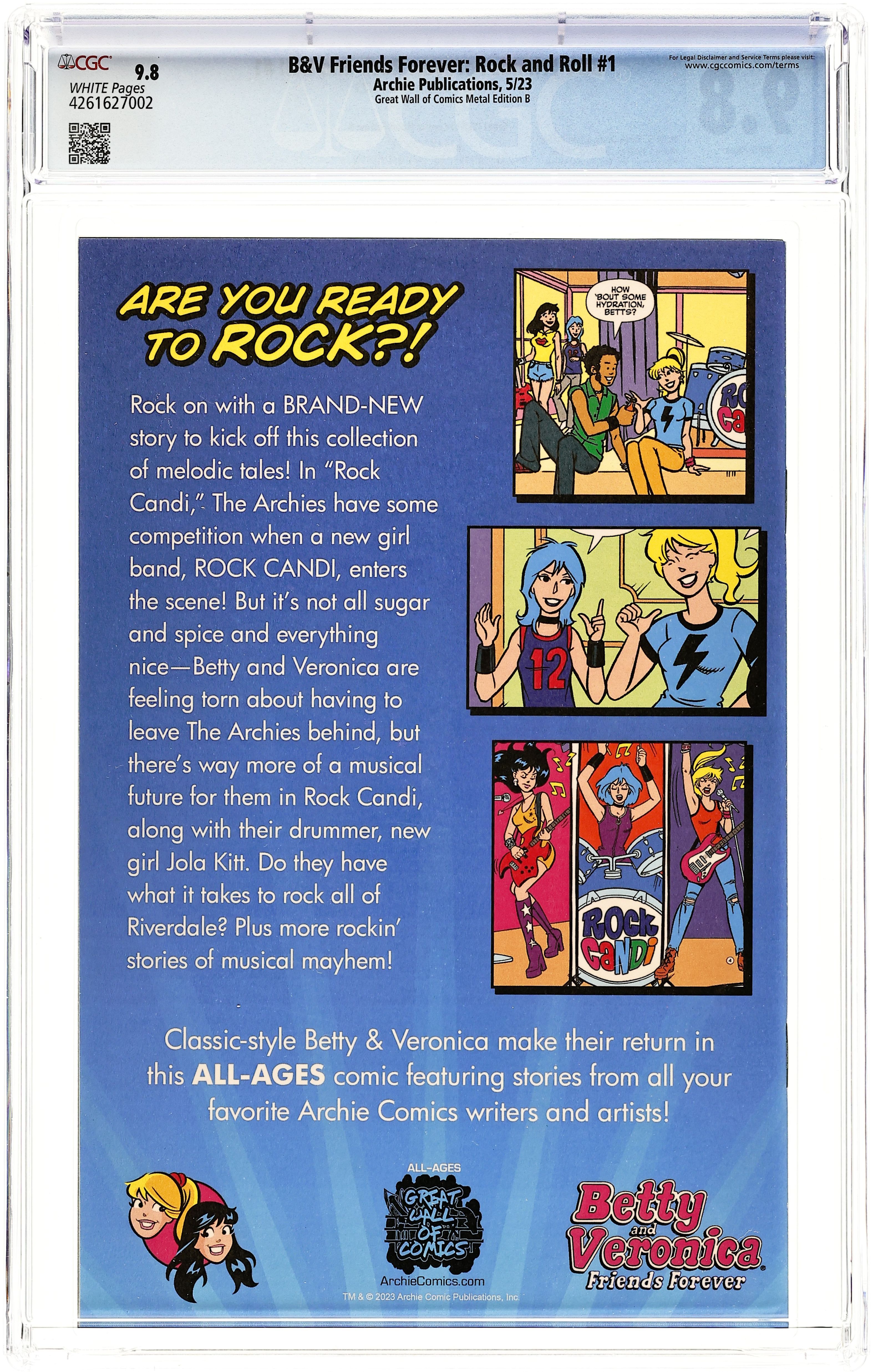 Published May 2023 by Archie Publications.Betty and Veronica Friends Forever Rock and Roll (2023 Archie) 1GWOC.B.METAL CGC 9.8
