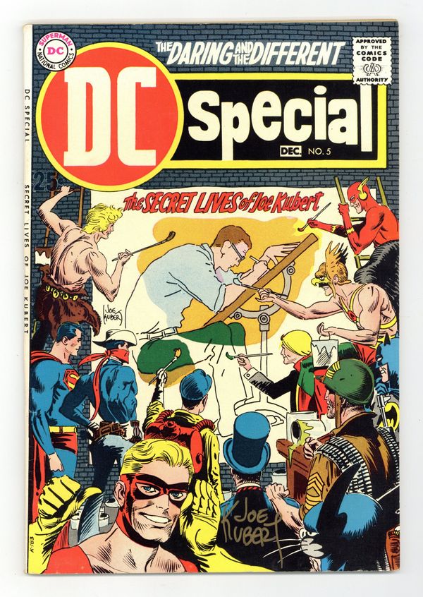 Starts May 11 The secret lives of Joe Kubert! Featuring: 5 page story "The Cartoonist -- at Home" starring Joe Kubert, Joe's family [Muriel Kubert (wife); Dave Kubert (son); Danny Kubert (son); Lisa Kubert (daughter); Adam Kubert (son); Andy Kubert (son)], Russ (Russ Heath?) and Gerda (Joe's secretary), by Joe Kubert; 12 page Sgt. Rock reprint story "Eyes of a Blind Gunner" starring Sgt. Rock, Easy Company [Wild Man; Jackie; Burt (all injured in this story); Bulldozer; Ice Cream Soldier] and Nazis, written by Robert Kanigher and drawn by Joe Kubert; 8 page story "Rider of the Winds" drawn by Joe Kubert; 12 page Hawkman reprint story "Menace of the Matter Master" starring Hawkman [Katar Hol; Carter Hall], Hawkgirl [Shayera Hol; Shiera Hall], Matter Master, Commissioner George Emmett and Mavis Trent, written by Gardner Fox and drawn by Joe Kubert; 2 page illustration "Joe Kubert's Characters" featuring Dr. Fate, Johnny Quick, Sargon the Sorcerer, Maximillian O'Leary, Hawkman, Flash, Guardian, Wildcat, Yellow Wasp, Vigilante, Zatara and Firehair by Joe Kubert; 1 page Seven Soldiers of Victory text article "Fact File #9" featuring Seven Soldiers of Victory [Vigilante; Green Arrow; Speedy; Star-Spangled Kid; Shining Knight; Crimson Avenger] (also referred to as the Law's Legionnaires); 13 page Viking Prince reprint story "Threat of the Ice King" written by Bob Haney and drawn by Joe Kubert. Cover by Joe Kubert. Cover price $0.25.