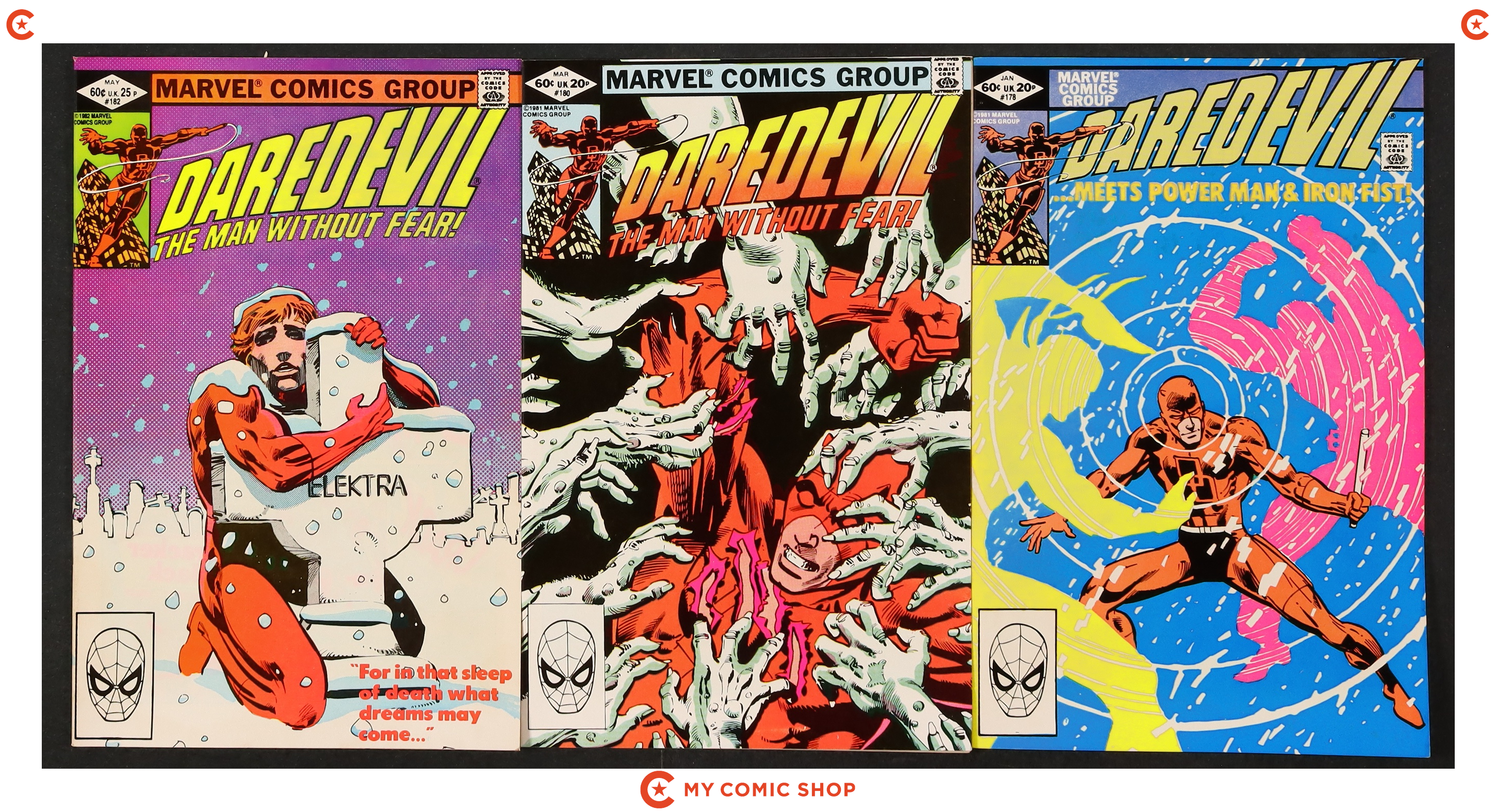 Starts Mar 23 Direct Edition. Cover pencils by Frank Miller, inks by Klaus Janson. Last Hand, script by Frank Miller, pencils by Frank Miller (breakdowns) and Klaus Janson (finished art), inks by Klaus Janson; Bullseye breaks out of prison; Elektra hunts down Foggy and is about to kill him until she recognizes him as Matt's buddy from college; Bullseye fights Elektra and kills her with her own sai; DD goes after Bullseye and ends up dropping him from a great height, breaking every bone in his body; Kingpin appearance; story narrated by Bullseye; story dedicated to the memory of Wally Wood 1927-1981. Full page pin-up ad for Marvel Fanfare, art by Michael Golden. Statement of Ownership average # of copies in preceding 12 months: 276,812 Cover price $1.00.