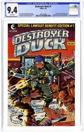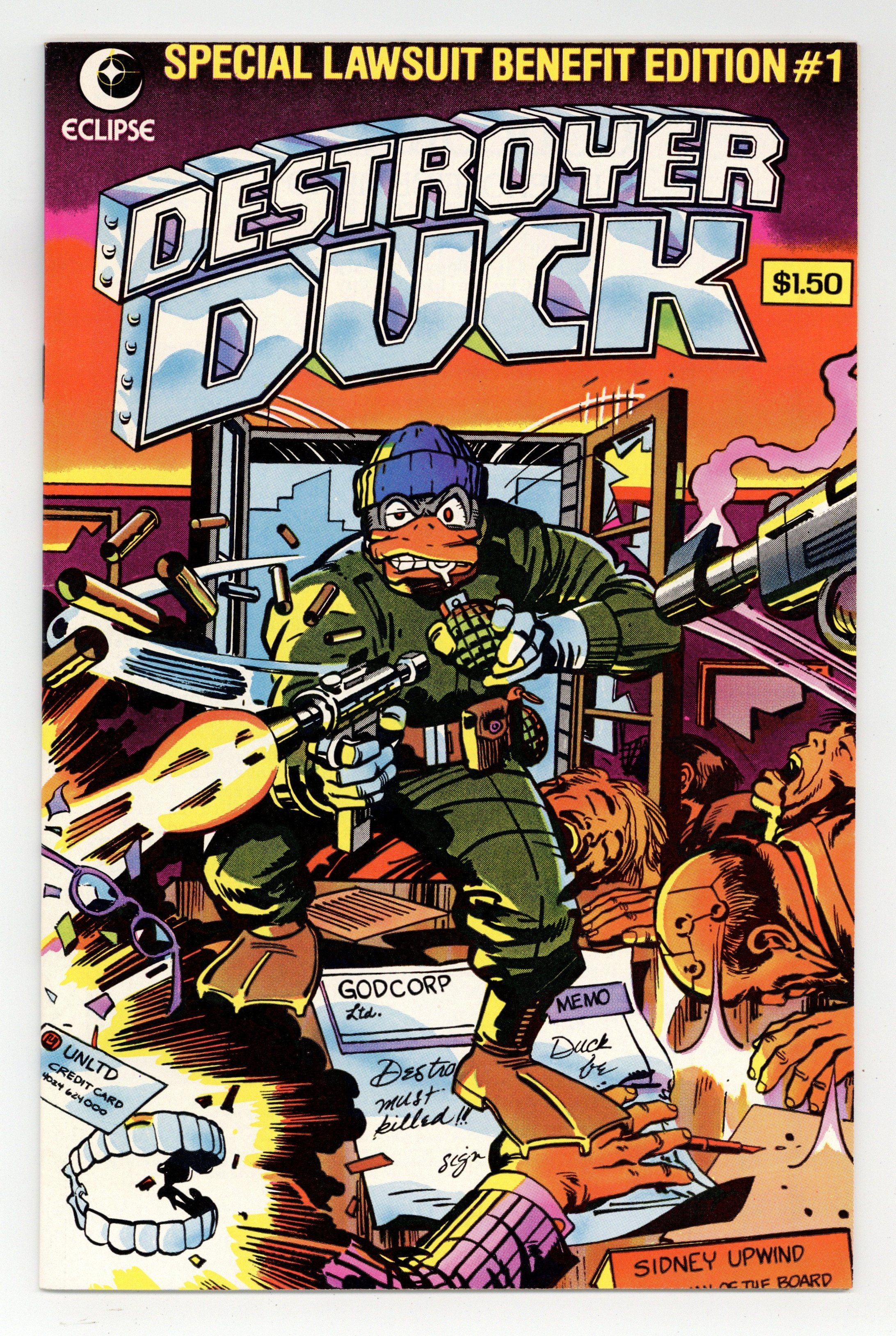 Starts May 25 "Special Lawsuit Benefit Edition." At the height of their legal battles with Marvel, Steve Gerber and Jack Kirby teamed up for this benefit comic, in which a gun-slinging duck seeks revenge against an evil megacorporation. Art and stories donated by Mark Evanier, Dan Spiegle, Scott Shaw!, Alfredo Alcala, Steve Leialoha, Shary Flenniken, Martin Pasko, and Joe Staton. All this plus the first-ever appearance of Sergio Aragones' Groo the Wanderer. Full color; 36 pages. Cover by Kirby and Neal Adams! Cover price $1.50.