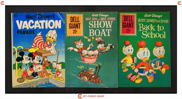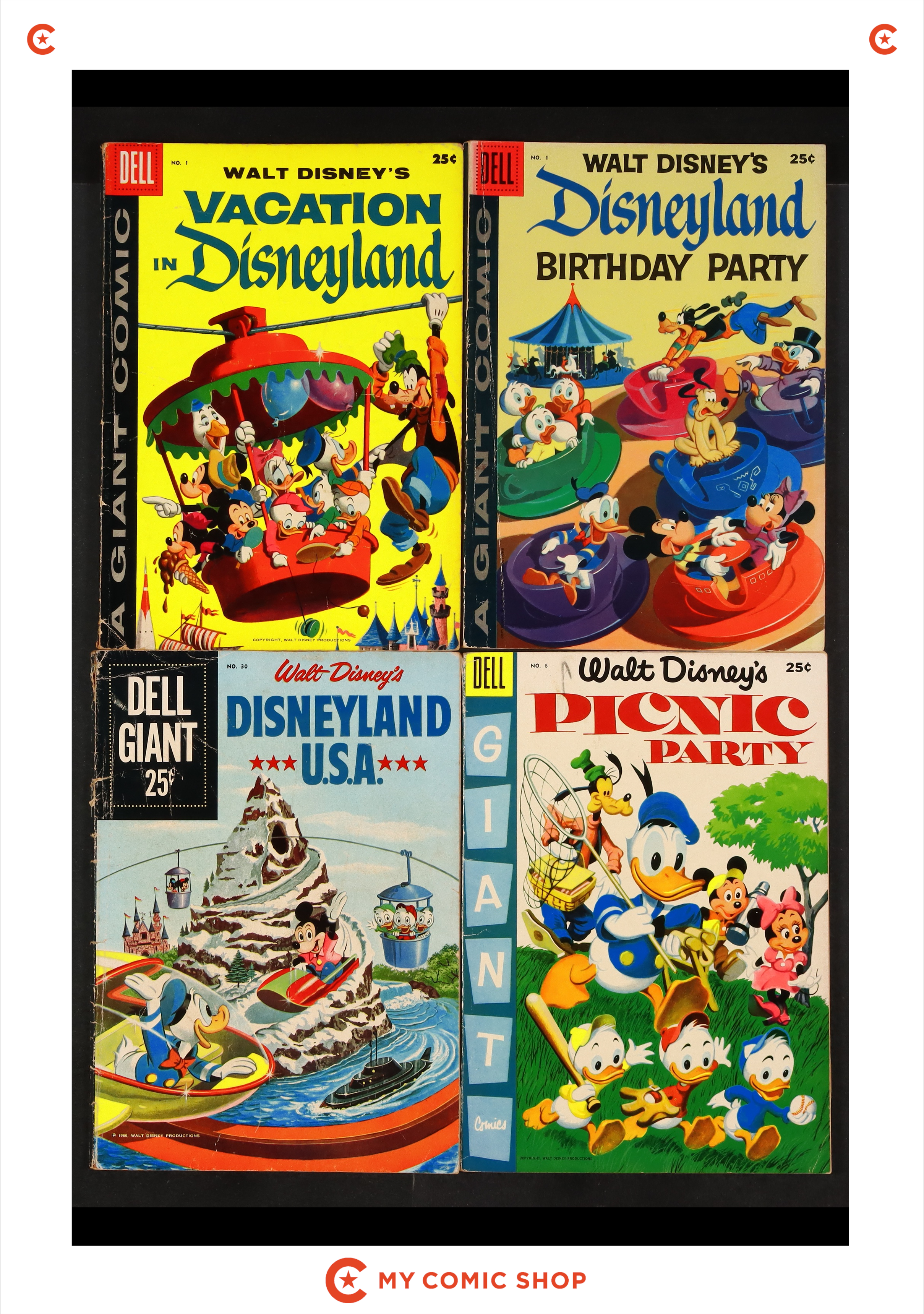 Issues 1B-25C of Dell Giant Disneyland Birthday Party (1958 Dell); 1B of Dell Giant Vacation In Disneyland (1958 Dell); 6 of Dell Giant Picnic Party (1955-1957 Dell); 30, 49A, and 55 of Dell Giant (1959-1961 Dell); and 3 of Dell Giant Vacation Parade (1950-1954 Dell). Most will grade in the GD range.