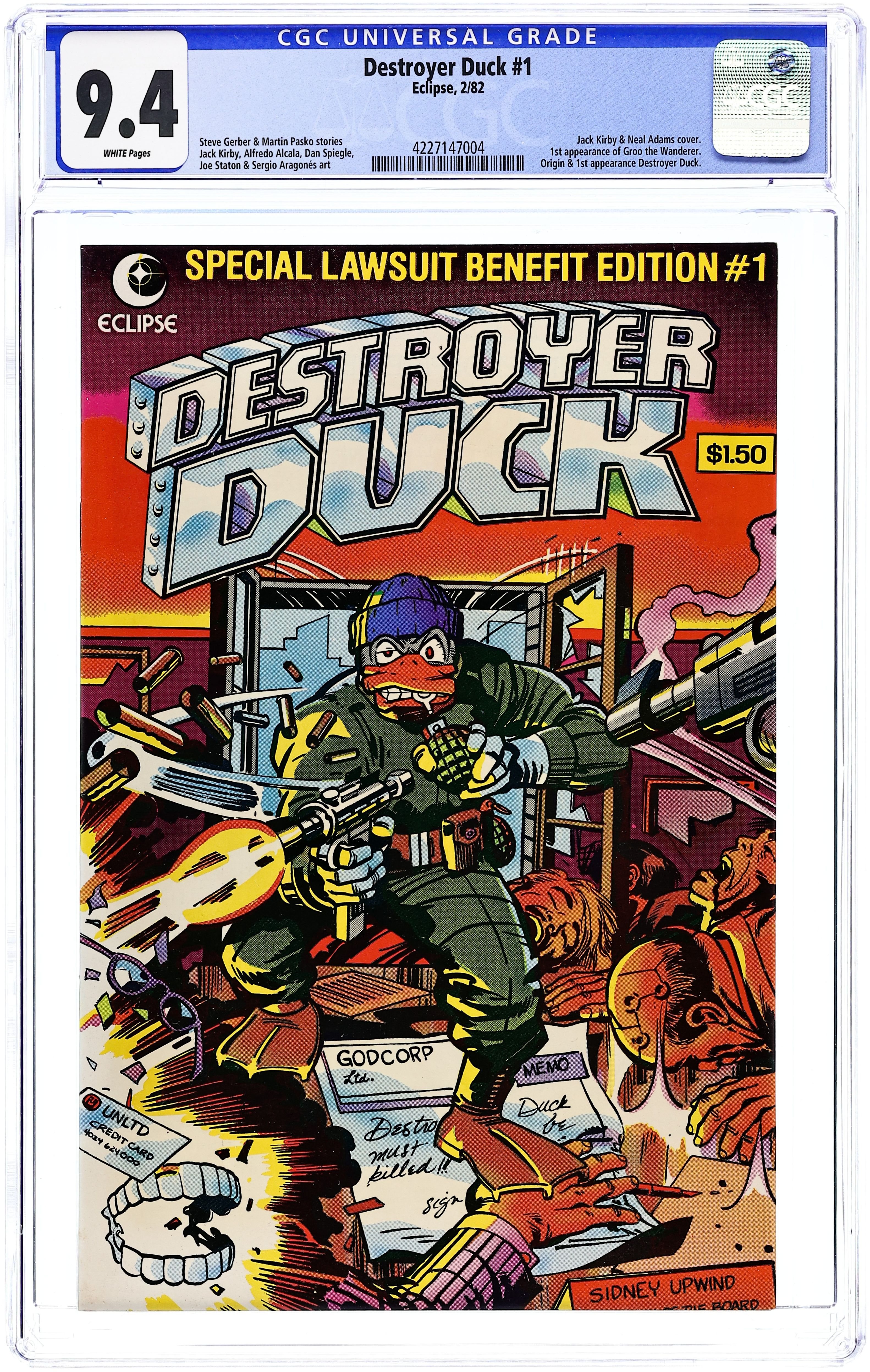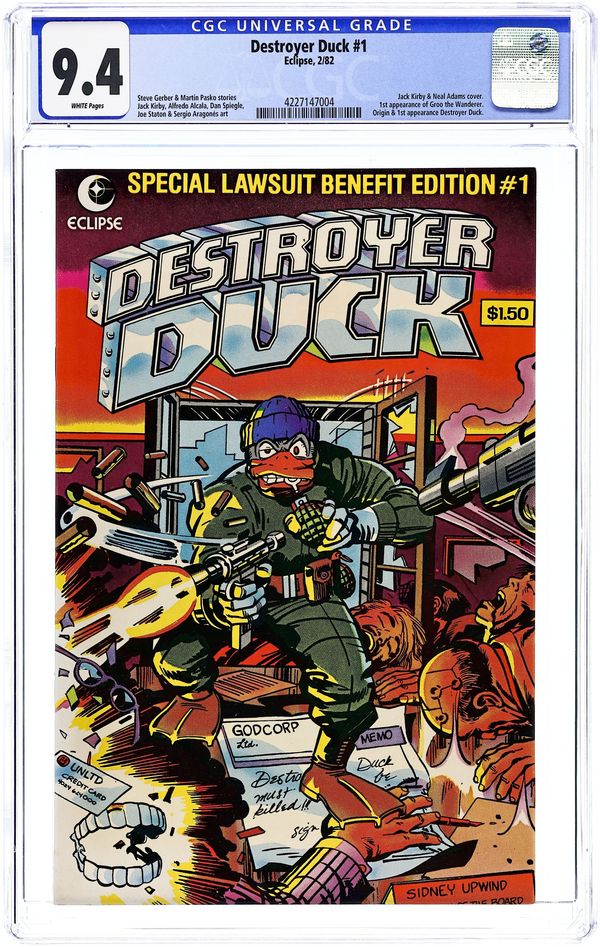 Starts May 4 "Special Lawsuit Benefit Edition." At the height of their legal battles with Marvel, Steve Gerber and Jack Kirby teamed up for this benefit comic, in which a gun-slinging duck seeks revenge against an evil megacorporation. Art and stories donated by Mark Evanier, Dan Spiegle, Scott Shaw!, Alfredo Alcala, Steve Leialoha, Shary Flenniken, Martin Pasko, and Joe Staton. All this plus the first-ever appearance of Sergio Aragones' Groo the Wanderer. Full color; 36 pages. Cover by Kirby and Neal Adams! Cover price $1.50.