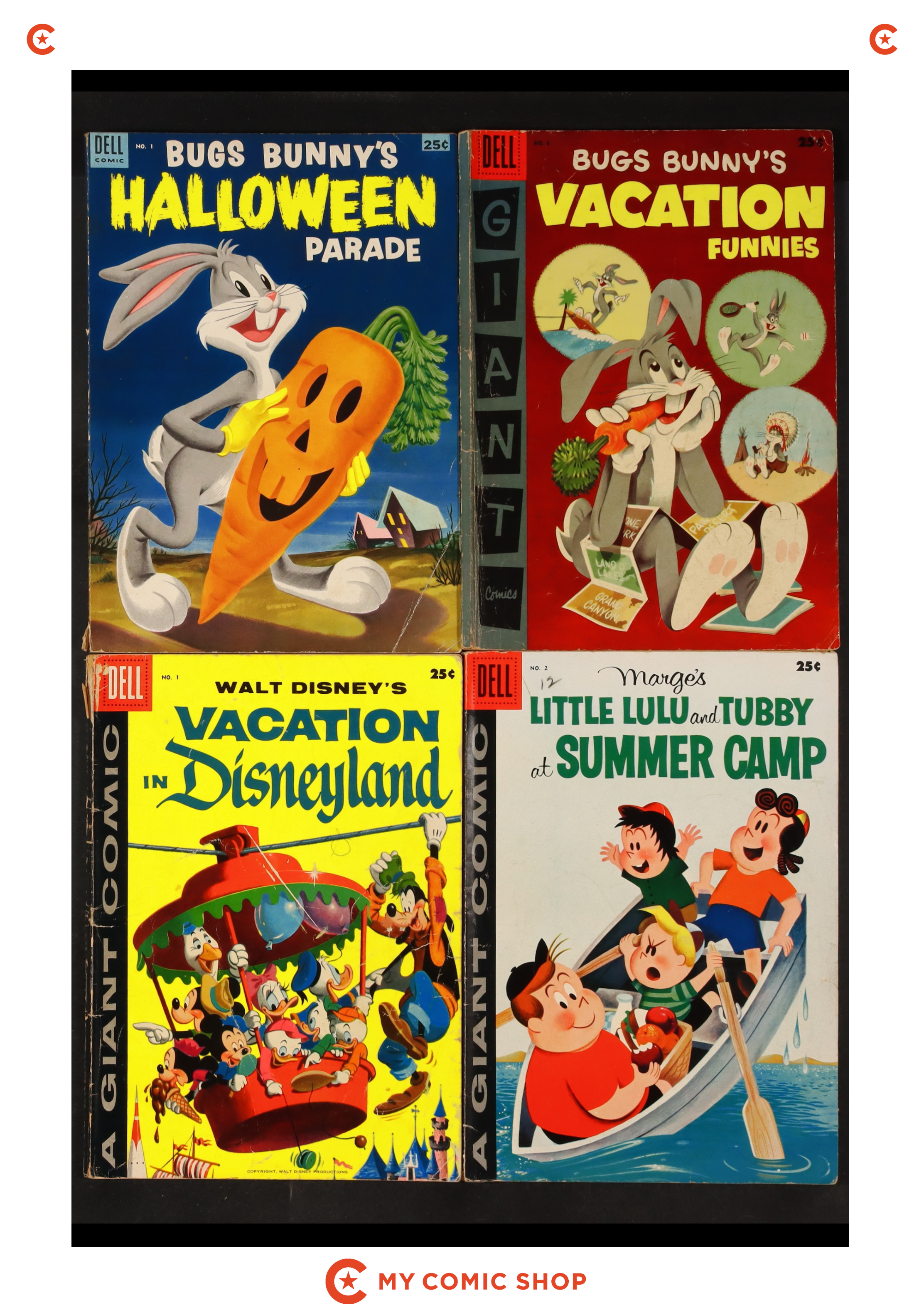 Issues 1 of Dell Giant Bugs Bunny's Halloween Parade (1953-1954 Dell); 6 of Dell Giant Bugs Bunny's Vacation Funnies (1951-1959 Dell); 1A of Dell Giant Vacation In Disneyland (1958 Dell); 2 of Dell Giant Marge's Little Lulu and Tubby at Summer Camp (1957-1958 Dell); 1 of Dell Giant Tom and Jerry's Back to School (1956 Dell); 1 of Dell Giant Tom and Jerry Summer Fun (1954-1957 Dell); and 1 of Dell Giant Silly Symphonies (1952-1959 Dell). Most will grade in the VG to GD range.