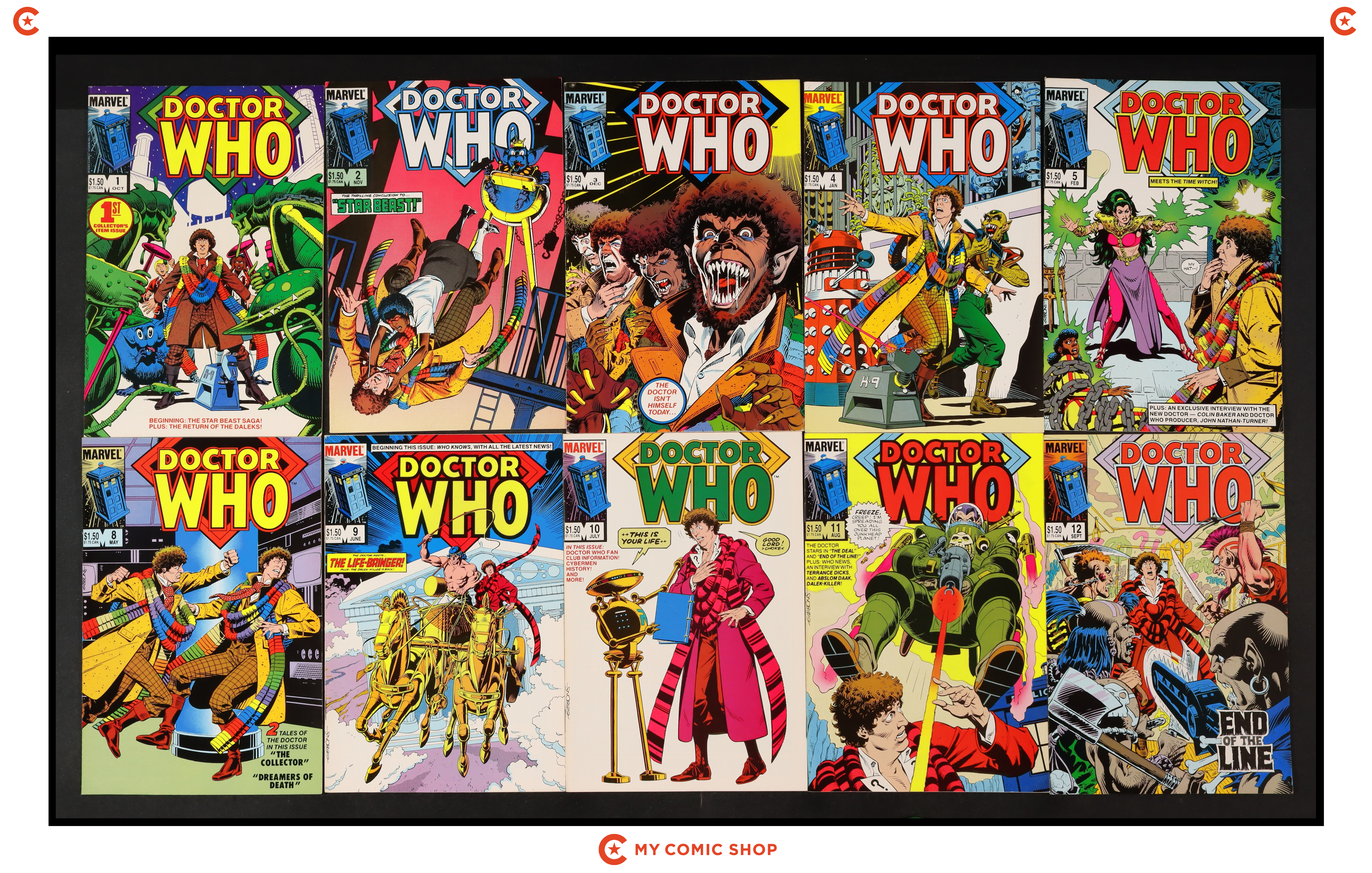 Issues 1, 2, 3, 4, 5, 8, 9, 10, 11, 12 of Doctor Who (1984 Marvel). Most will grade in the VF- to VF+ range.