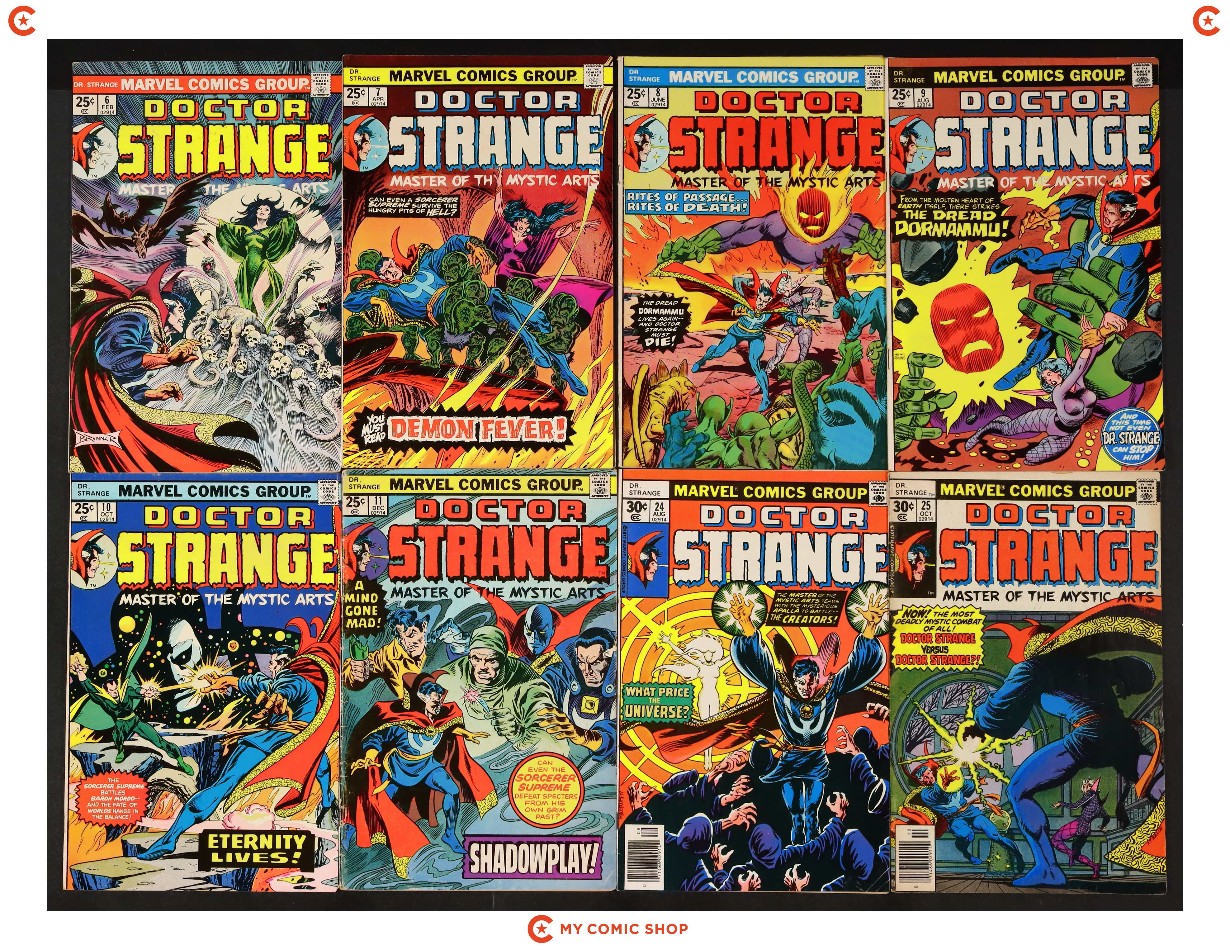 Issues 6-11, 24, and 25 of Doctor Strange (1974 2nd Series). Most will grade in the FN to VG range.