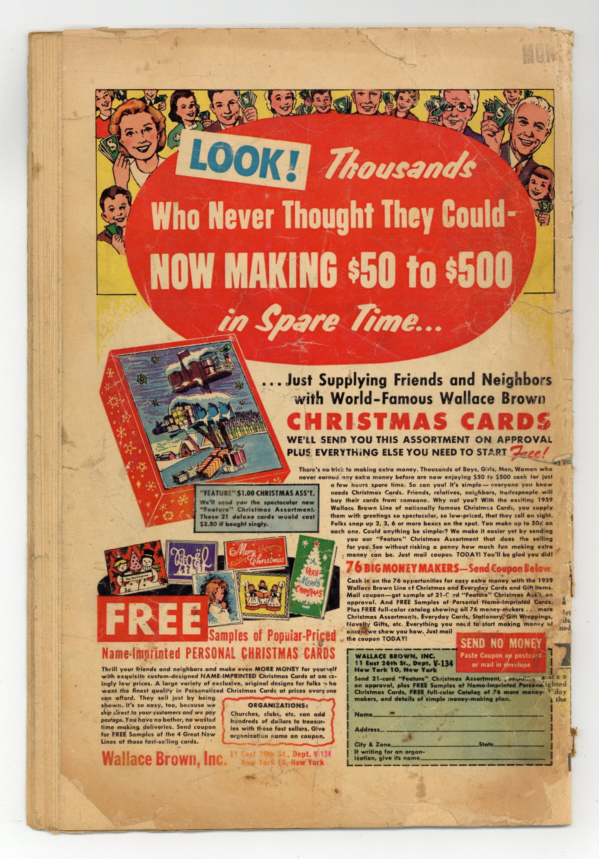 Starts Jan 3 Cover by Bill Everett. "The Only Man In the World" (Part 1), art by Jerry Robinson; Aliens from dimension X stop time and then destroy humanity. "I Made a Monster," art by John Forte; When a jilted scientist is building a Frankenstein monster to kill for him, he decides to test it by using the type of lipstick his love interest wears as a kill trigger in order to pay her back for spurning him. "Last Verdict" text story. "The Hungry Animal!," art by Ed Goldfarb; Synopsis: When two robbers murder a retired sea captain in his seashore house, they decide to kill his pet as well, lest it begin to howl before they have time to get far enough away from the scene of the crime. "The Black Box!," art by Mac Pakula; A shoplifter regrets stealing and opening a black box from a "monster sale." "My Brother's Killer!," art by Paul Reinman; A brother decides to murder his brother for an inheritance, but when the train they are traveling crashes, he decides to merely leave him to perish in the fire. When the will is read, it is revealed that the dead man was the only person who knew the location of the mine wherein the fortune was kept. 36 pgs., full color. $0.10. Cover price $0.10.