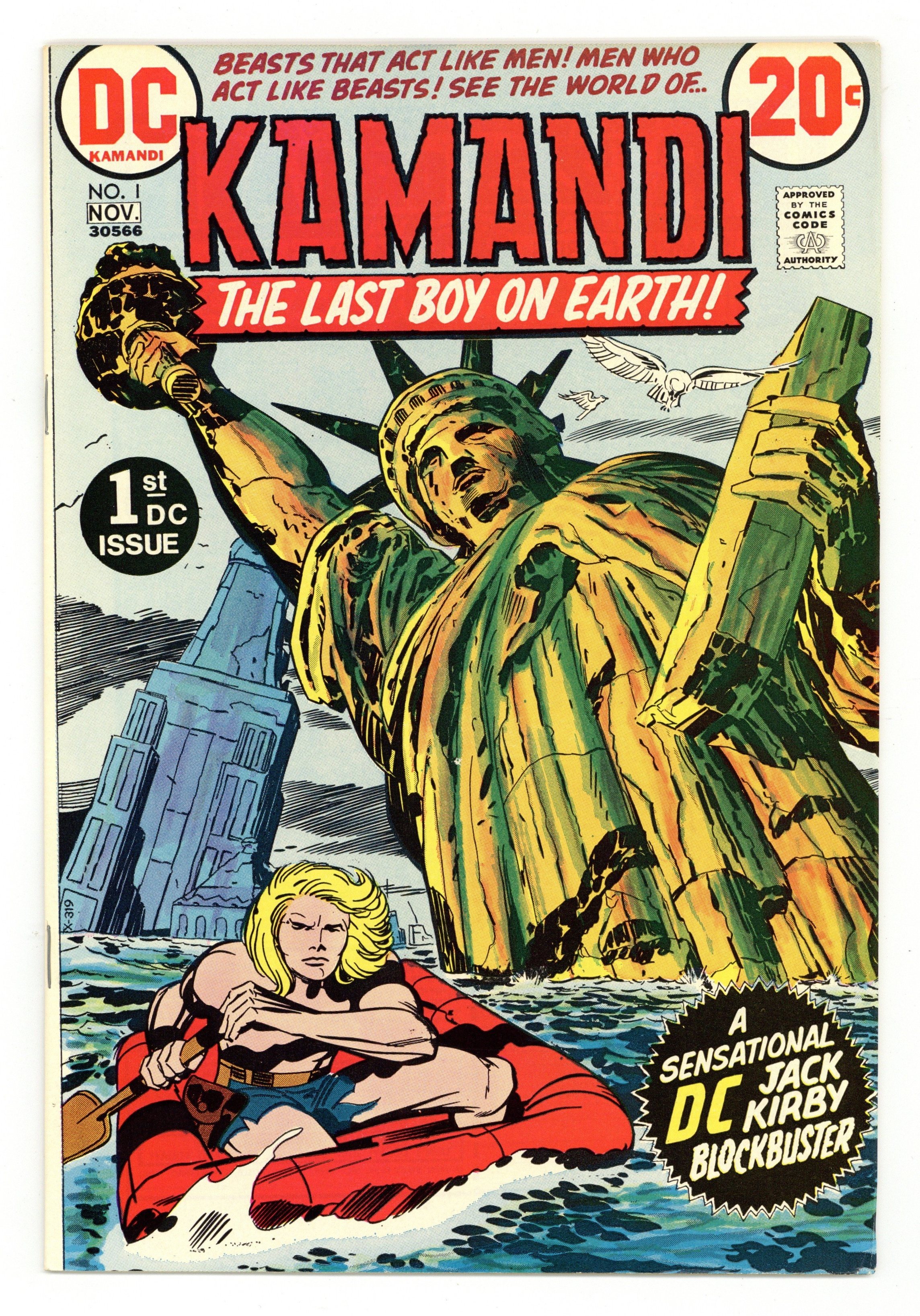 Starts Dec 15 1st appearance and origin of Kamandi. "The Last Boy on Earth." Script and pencils by Jack Kirby, inks by Mike Royer. Cover by Kirby and Royer. A series that borrows many concepts from Planet of the Apes, Kamandi takes place in an alternate future where animals have mutated into bipedal beings of intelligence and where humans are treated like savage beasts. Kamandi avenges the death of his grandfather, who was killed by wolves, but is then captured by a tiger named Caesar, who turns him over to dog-scientist Dr. Canus. Canus proceeds to help Kamandi, and this is where the so-called last boy on earth hooks up with Ben Boxer, a mutated human who can turn to living metal. Cover price $0.20.
