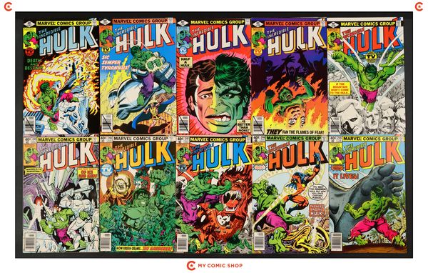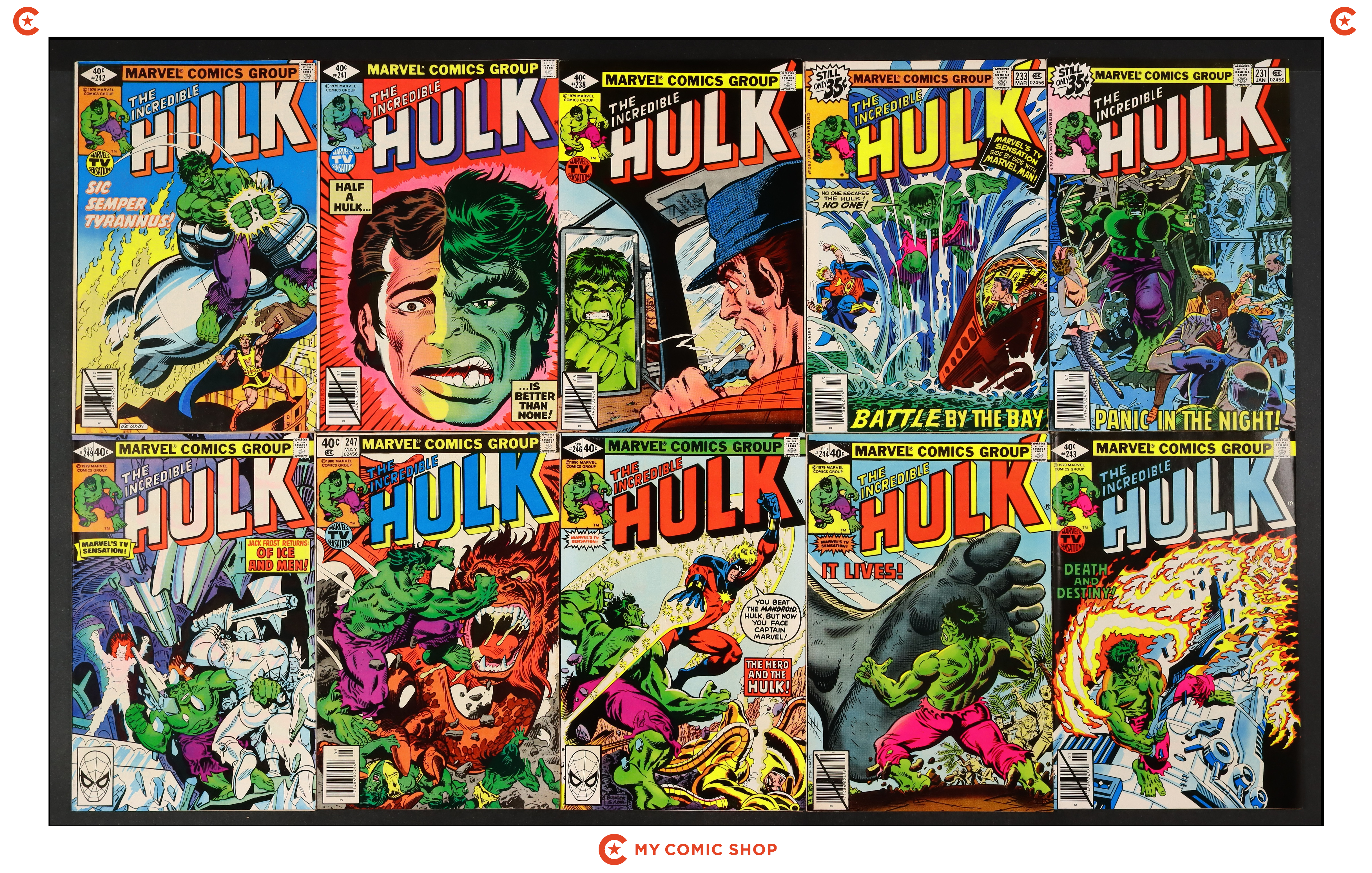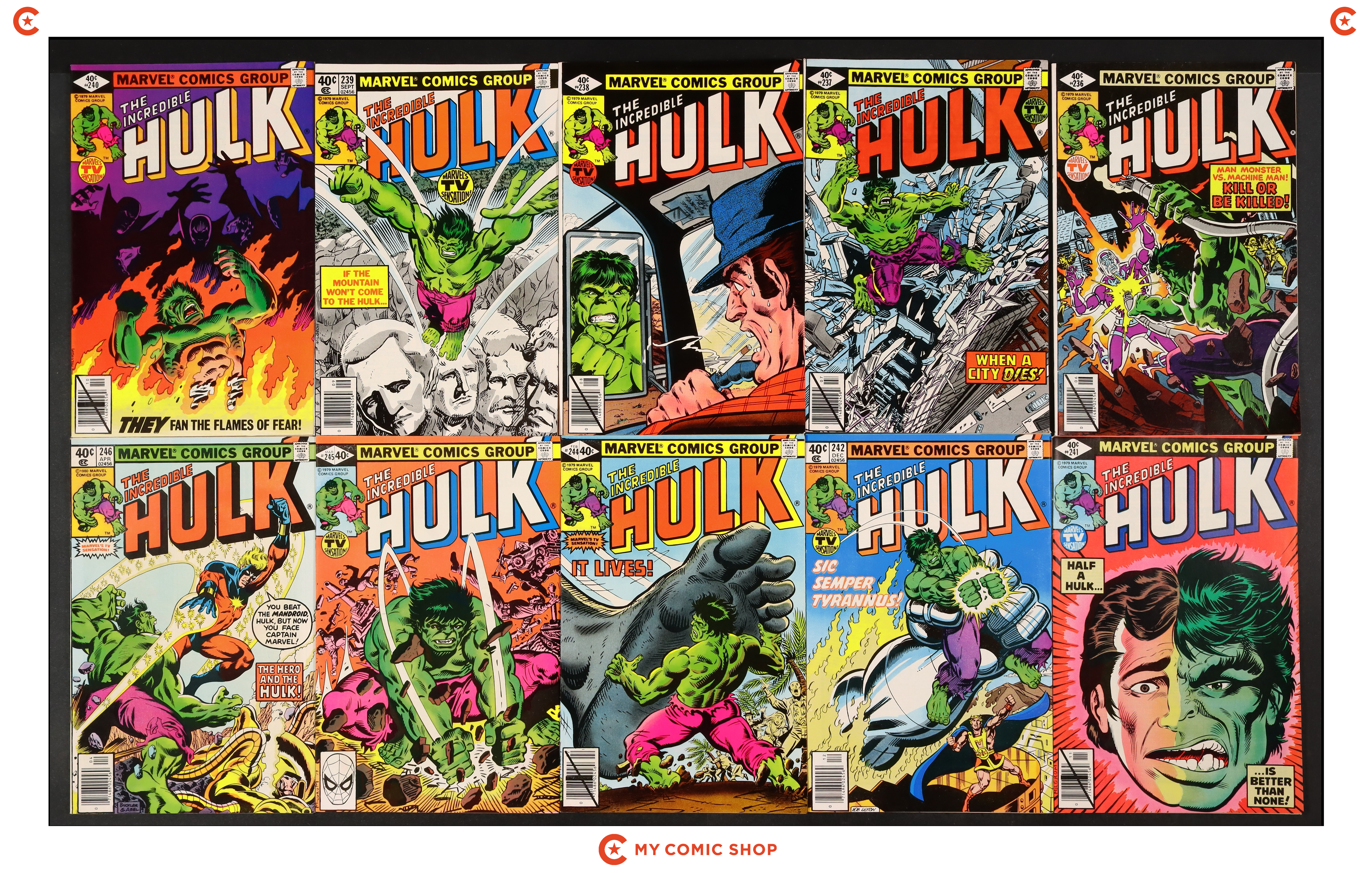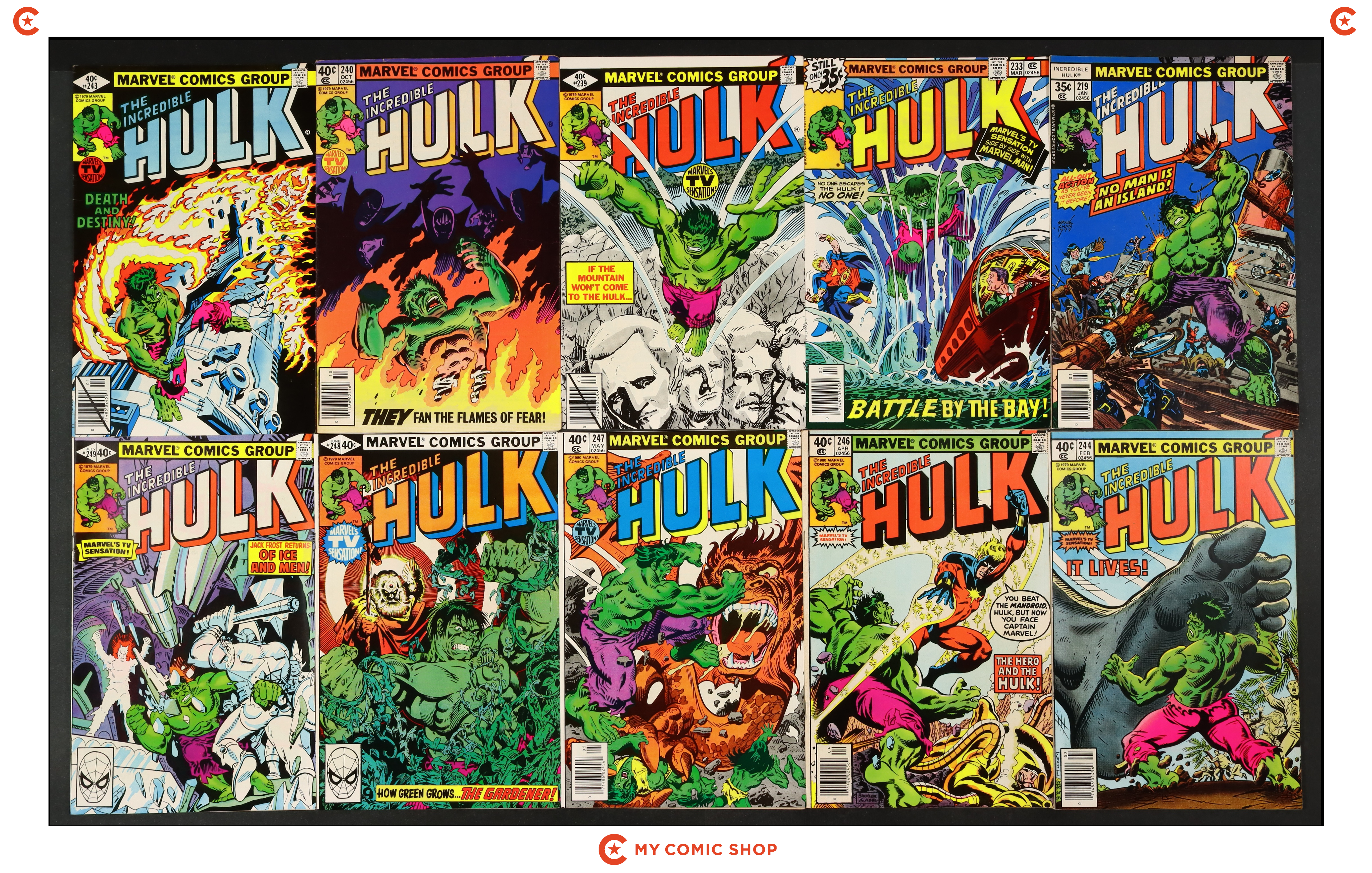 Issues 231, 233, 238, 241-244, 246, 247, and 249 of Incredible Hulk (1962 Marvel 1st Series). Most will grade in the FN range with a couple grading VF.