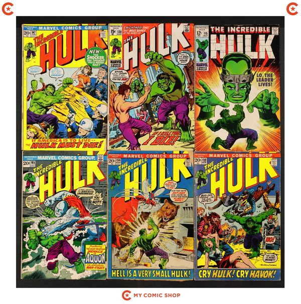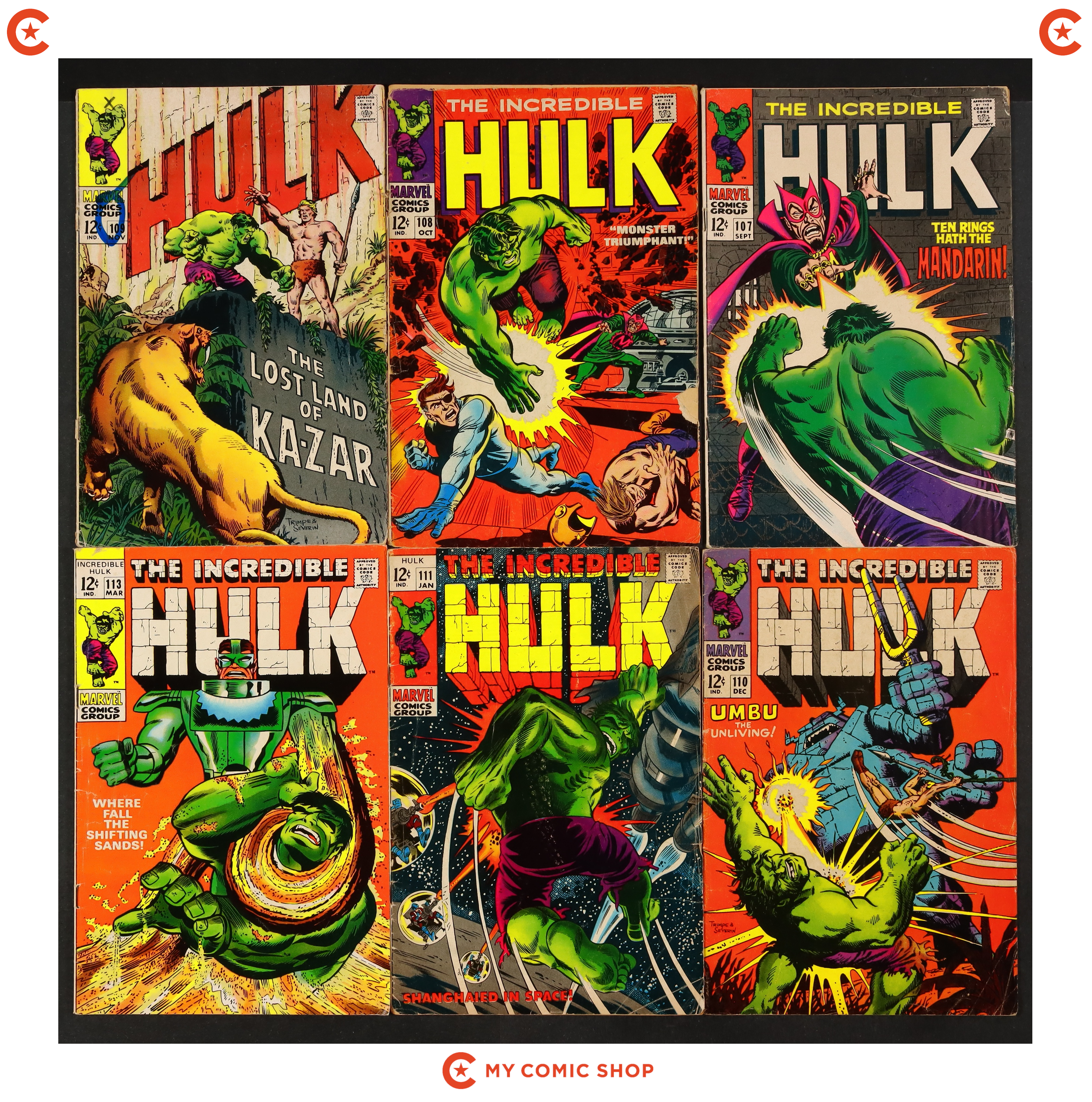 Issues 107-111 and 113 of Incredible Hulk (1962 Marvel 1st Series). Most will grade in the VG to GD range with #108 grading FR (full length spine split).