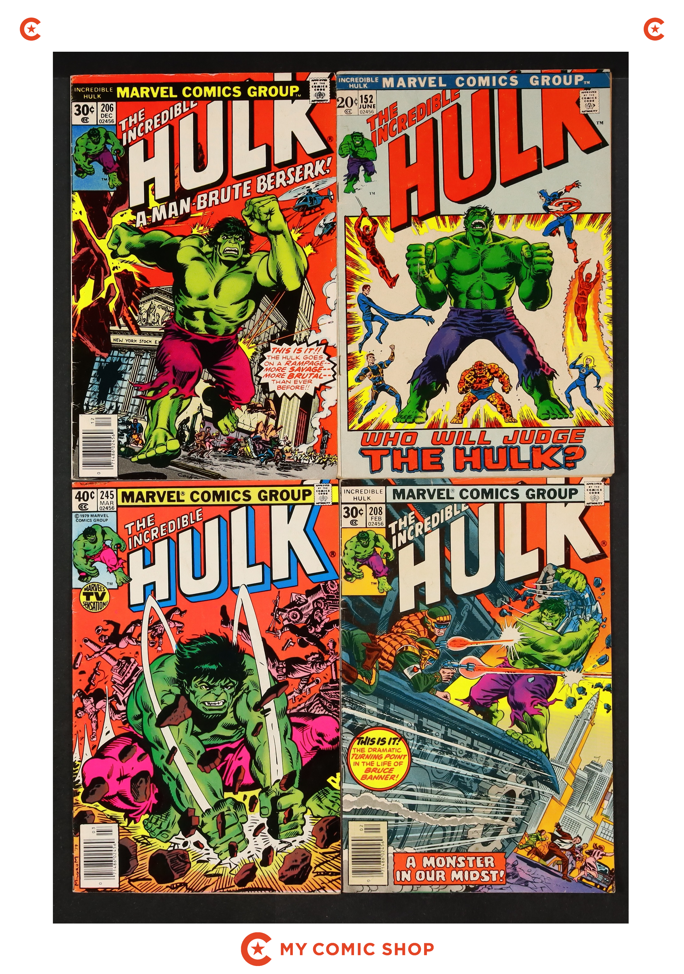 Issues 152, 206, 208, and 245N of Incredible Hulk (1962 Marvel 1st Series). Most will grade in the VG range.