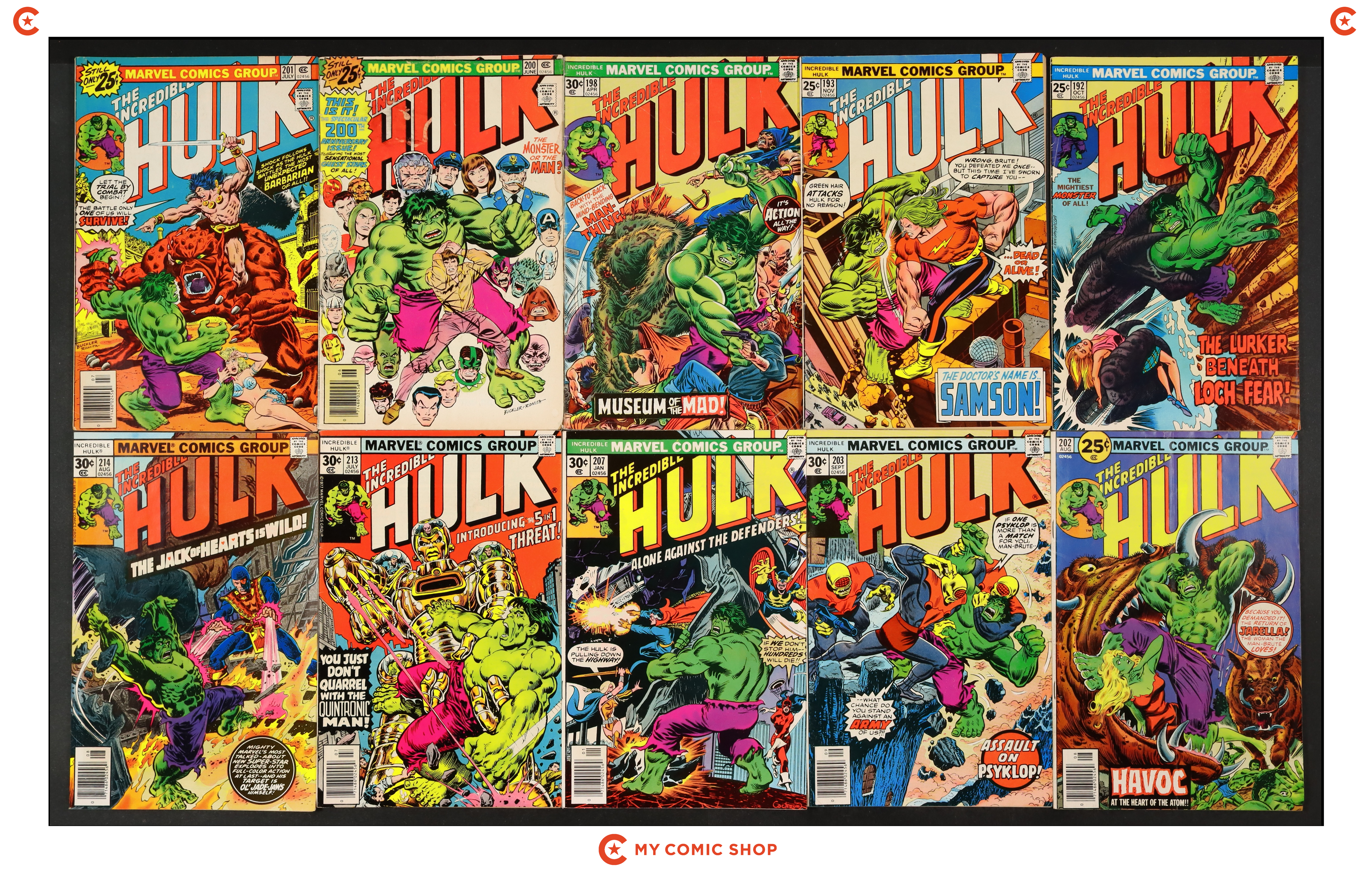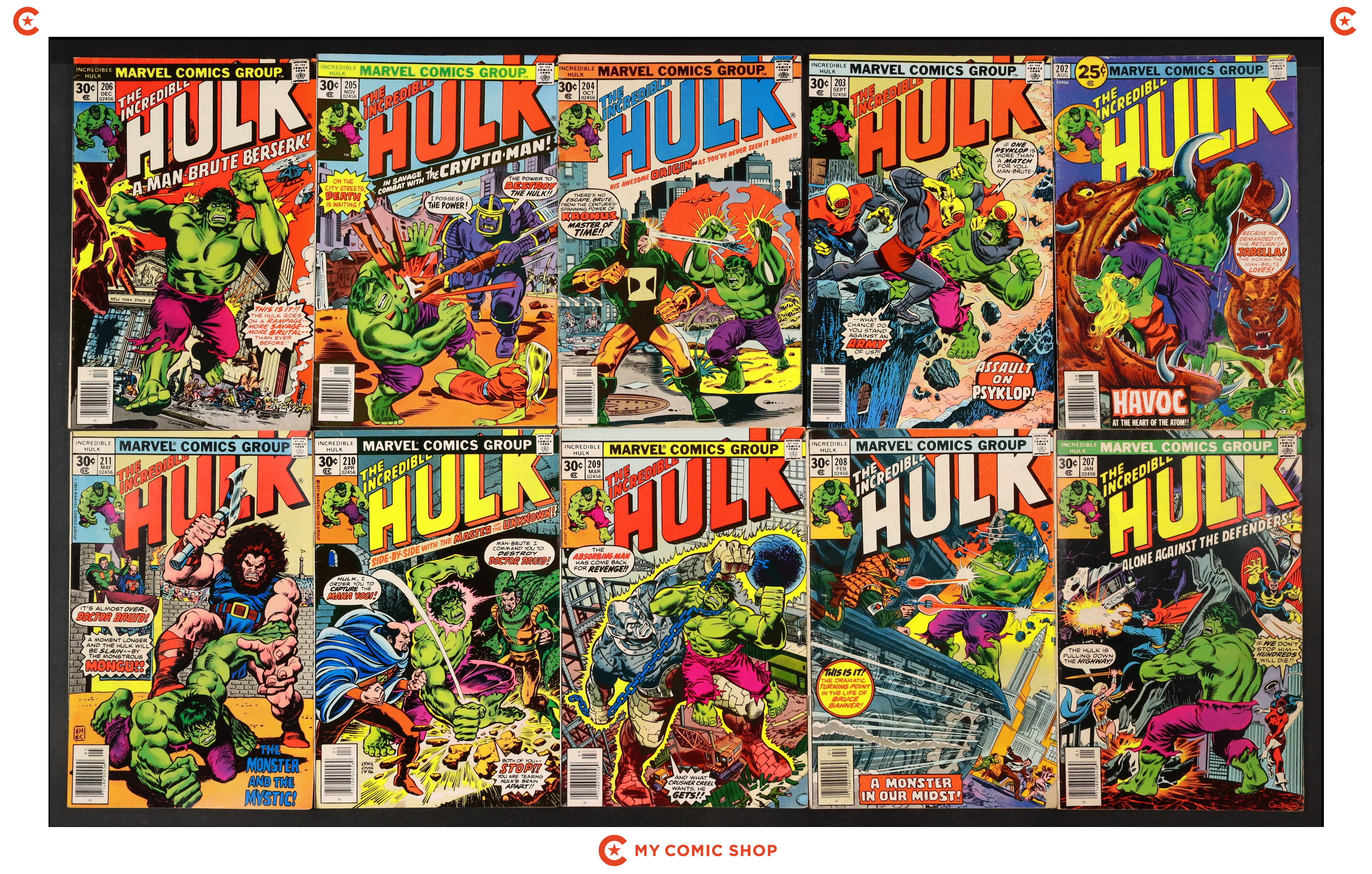 Issues 202-211 of Incredible Hulk (1962 Marvel 1st Series). Most will grade in the VG range with a couple grading GD.