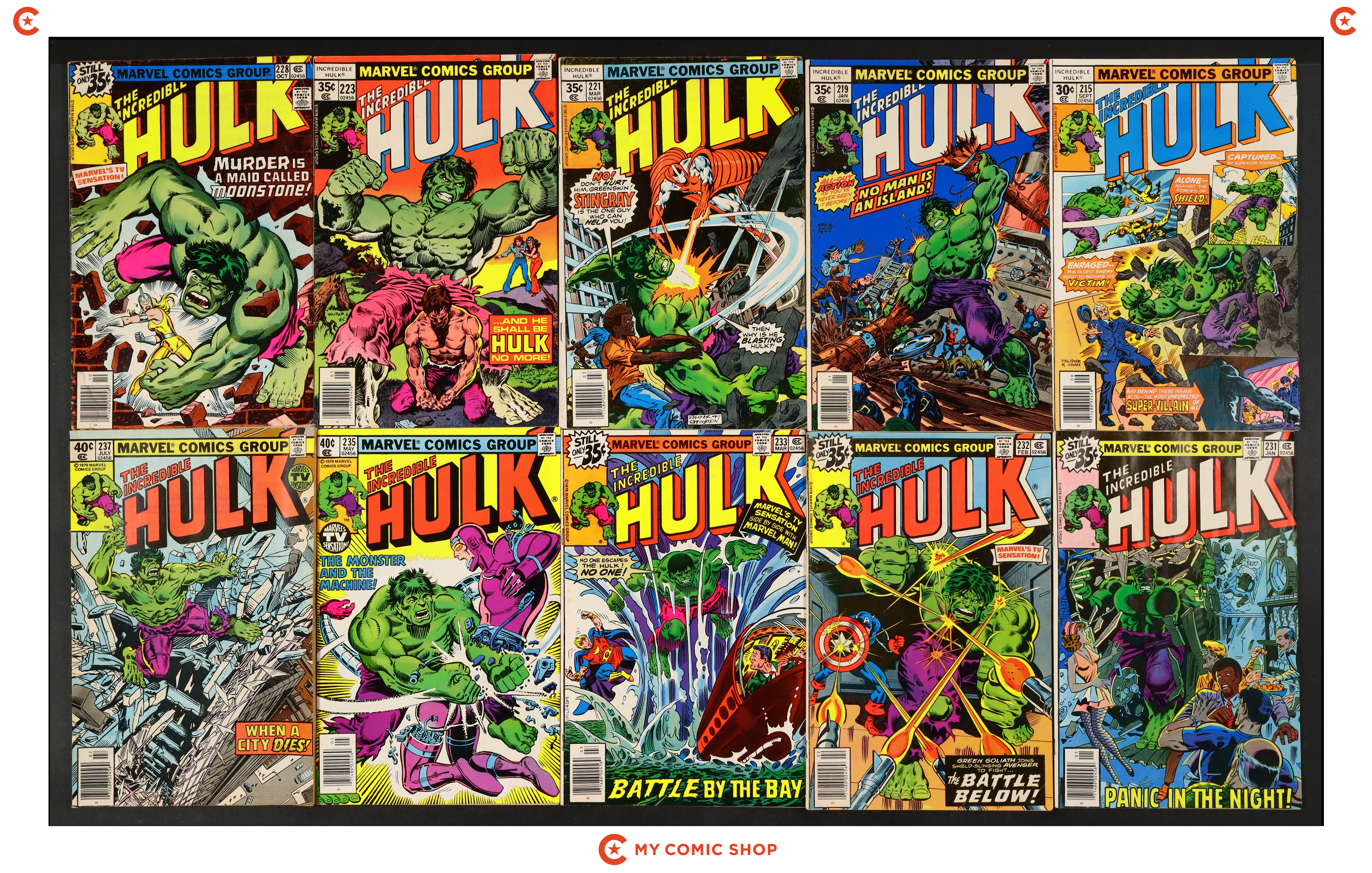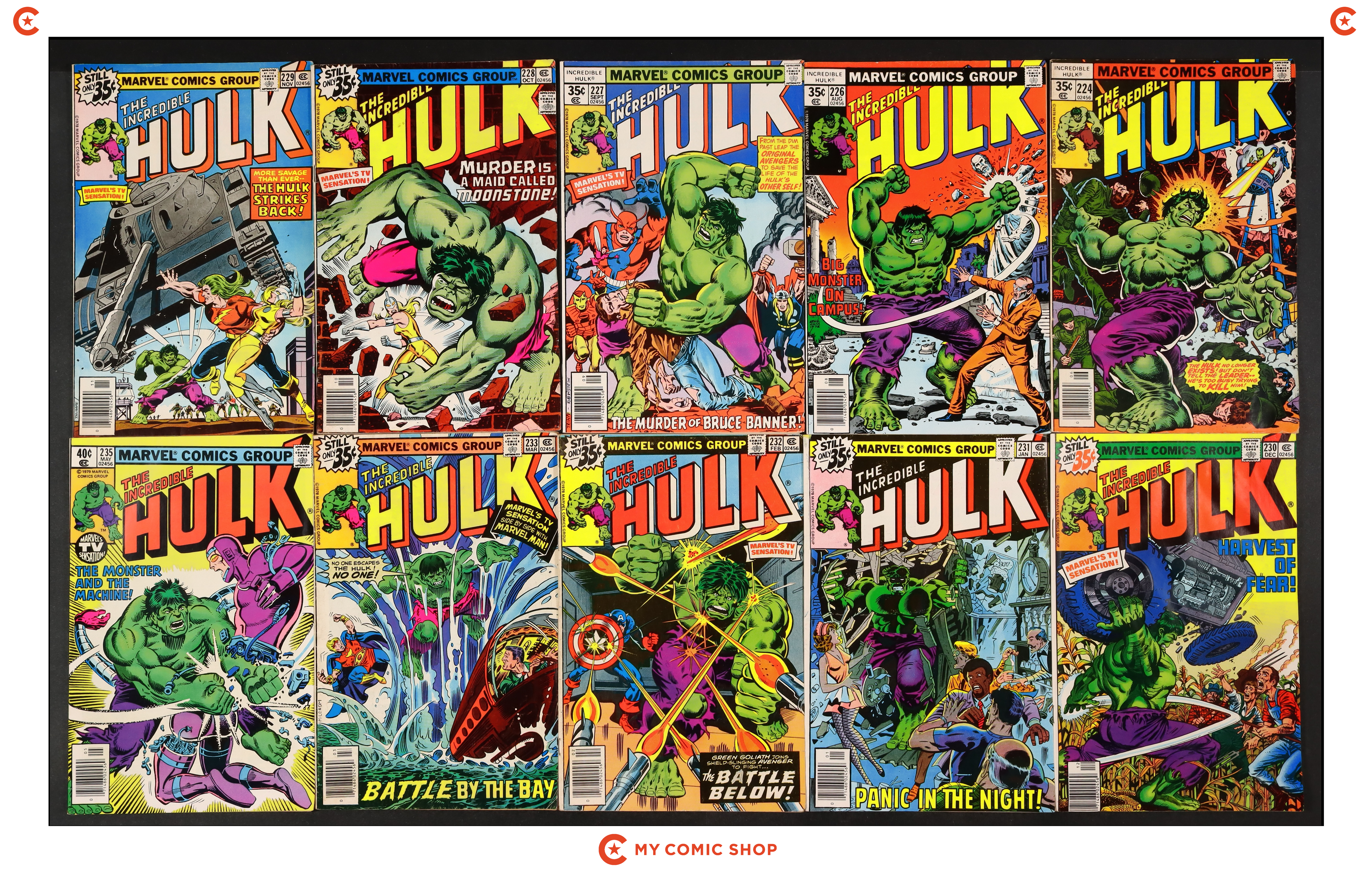 Issues 224, 226-233, and 235 of Incredible Hulk (1962 Marvel 1st Series). Most will grade in the FN to VG range with a couple grading GD.