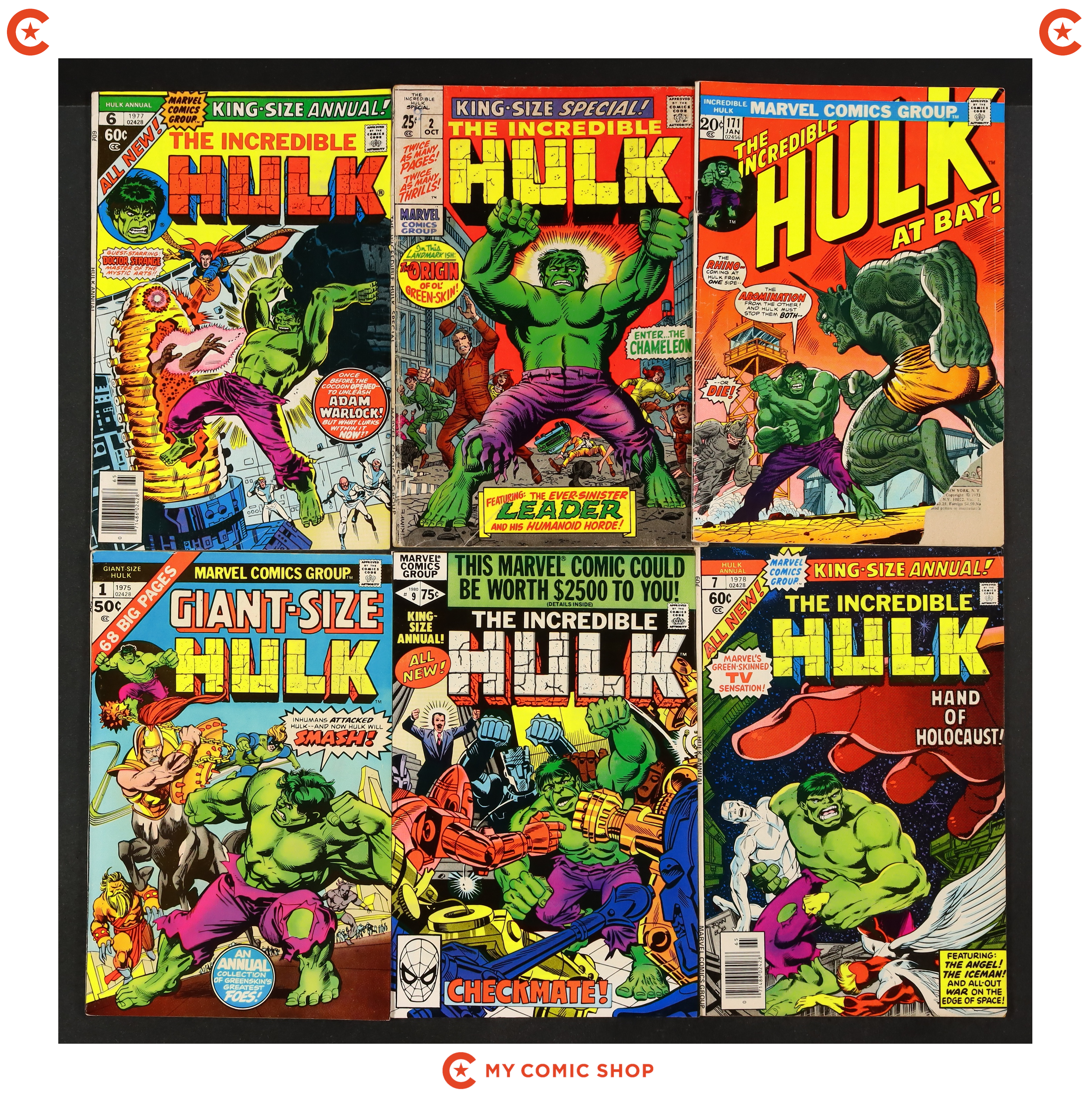 Issues 171 of Incredible Hulk (1962 Marvel 1st Series); 2, 6, 7, and 9 of Incredible Hulk (1962 Marvel 1st Series) Annual; and 1 of Giant Size Hulk (1975 1st Series). Most will grade in the VG to GD range with a couple grading FN.