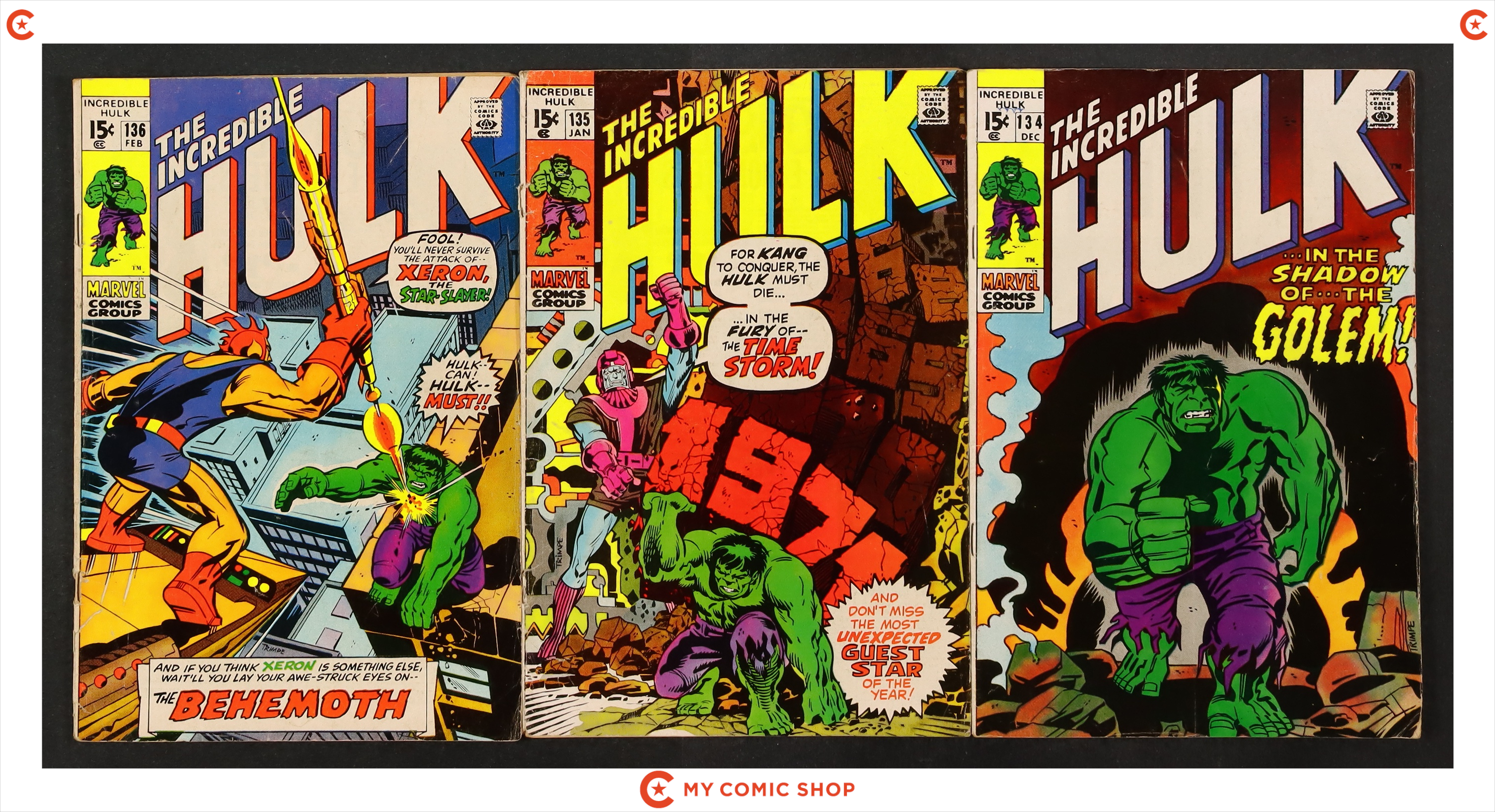 Issues 114, 121, 124, 132, and 134-136 of Incredible Hulk (1962 Marvel 1st Series). Most will grade in the VG to GD range with #124 grading FR.