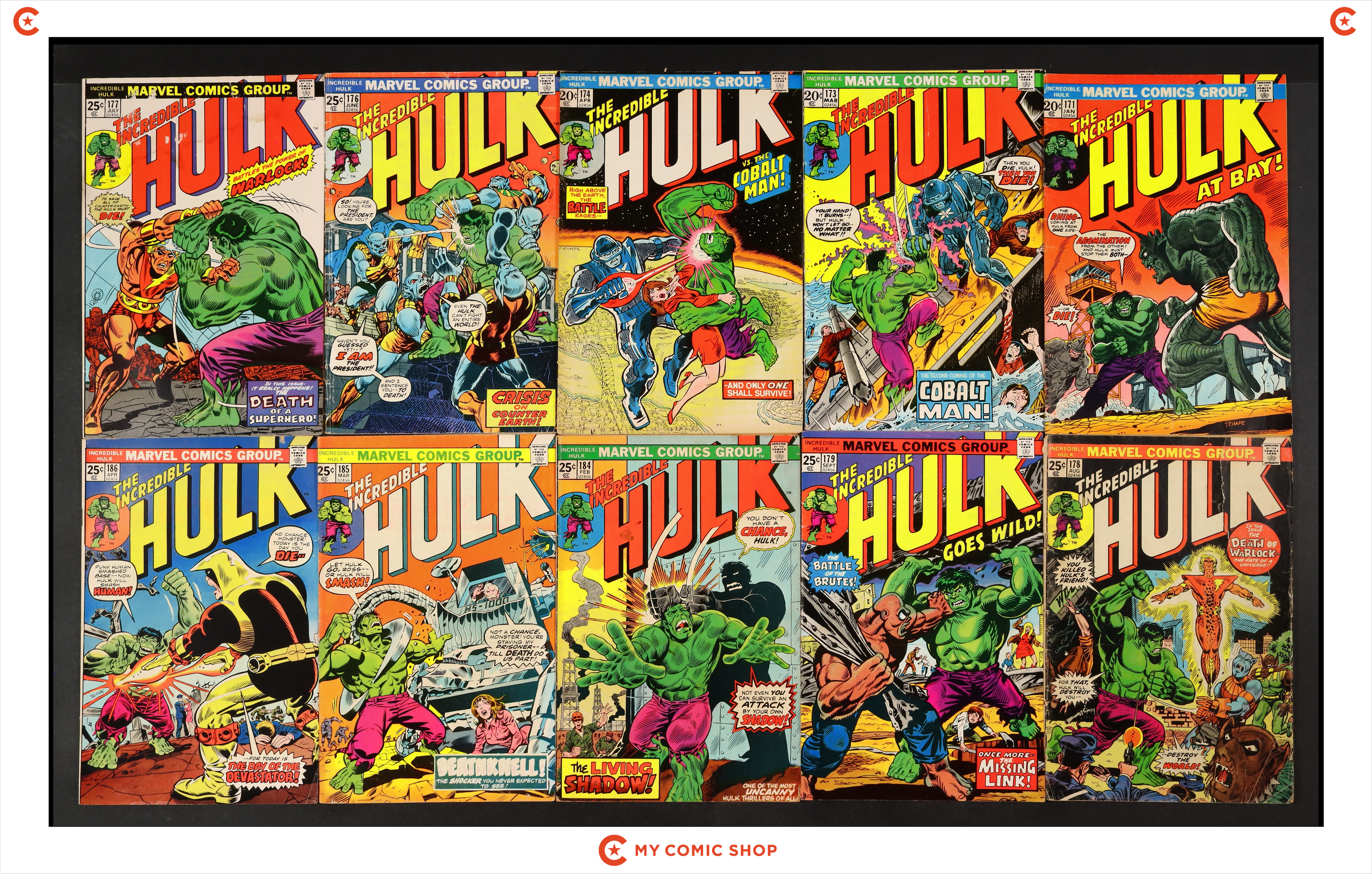 Issues 171, 173, 174, 176-179, and 184-186 of Incredible Hulk (1962 Marvel 1st Series). Most will grade in the VG to GD range with #174 grading FR (missing Marvel Value Stamp).