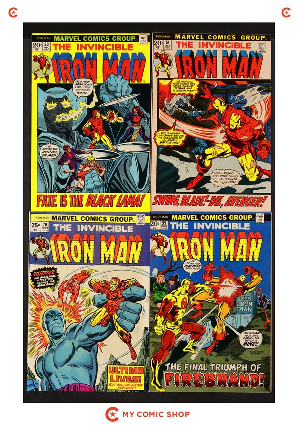 Issues 51, 53, 59, and 70 of Iron Man (1968 1st Series). Most will grade in the FN to VG range.