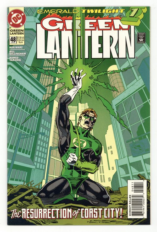 Starts May 18 Direct Edition. Emerald Twilight: Part 1 of 3. "The Past!" Story by Ron Marz. Art by Bill Willingham, Robert Campanella, and Romeo Tanghal. It's the beginning of the end for Hal Jordan. In this seminal chapter in the life of Green Lantern, Hal returns to ground zero and attempts to use his Power Ring to resurrect the devastated Coast City. But what happens if he doesn't have enough power? Don't miss the most unexpected turn in the life of Hal Jordan as DC counts down to a very special 50th issue. NOTE: 1st appearance of Kyle Rayner. Cover price $1.50.