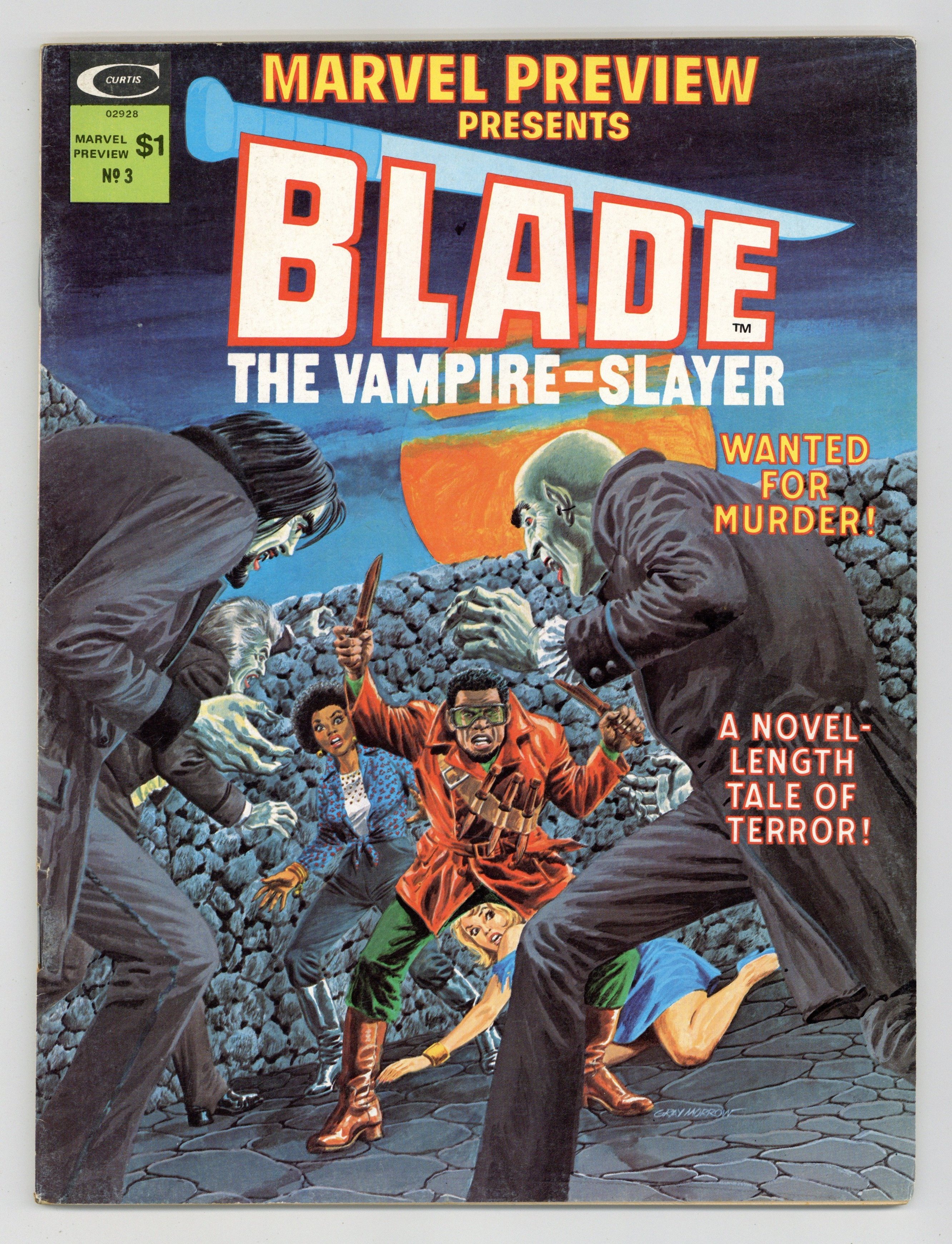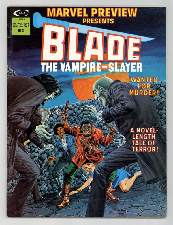 Starts Feb 2 Cover art by Gray Morrow; The Night Josie Harper Died starring Blade the Vampire Slayer, written by Chris Claremont, art by Tony DeZunga; Trail of Blood, Trail of Tears starring Blade, written by Claremont, pencils by DeZunga, inks by Rico Rival; Dawn of Blood starring Blade, written by Claremont, art by Rival; Hellmorn! Blade story, written by Claremont, art by Rival; A Short Picto-History of Blade written by Scott Edelman; and Titan promo ad with art by Rich Buckler. 76 pgs. Cover price $1.00.