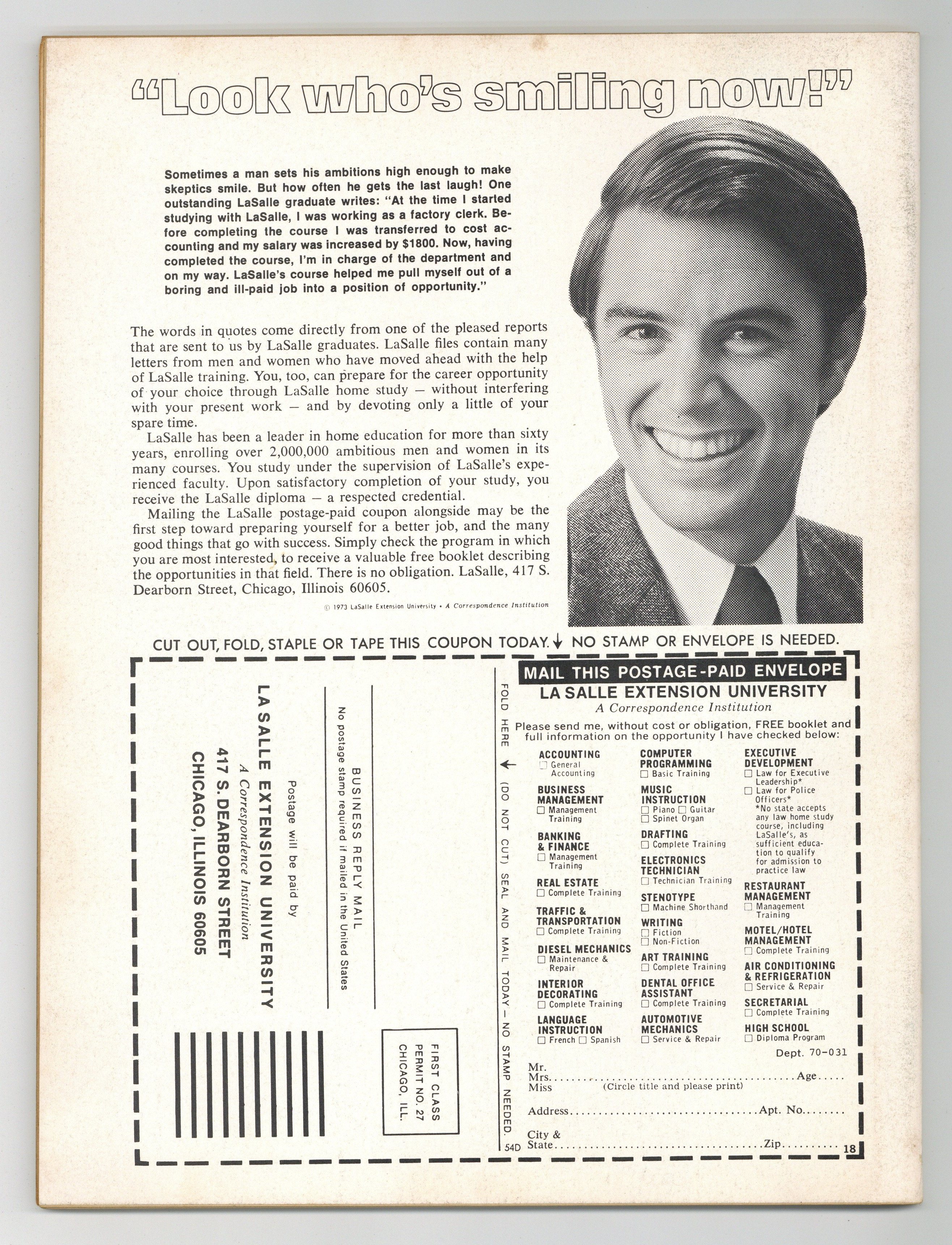 Starts Jan 26 Cover art by Gray Morrow; Death Sentence first origin story for the Punisher written by Gerry Conway, art by Tony DeZuniga; The Executioner Speaks Out! text article by David Anthony Kraft; The Power Broker Resolution! starring Dominic Fortune, written by Len Wein, art by Howard Chaykin; Thor promo ad with art by Virgilio Redondo; and an ad for all the Marvel magazines. 84 pgs. Cover price $1.00.