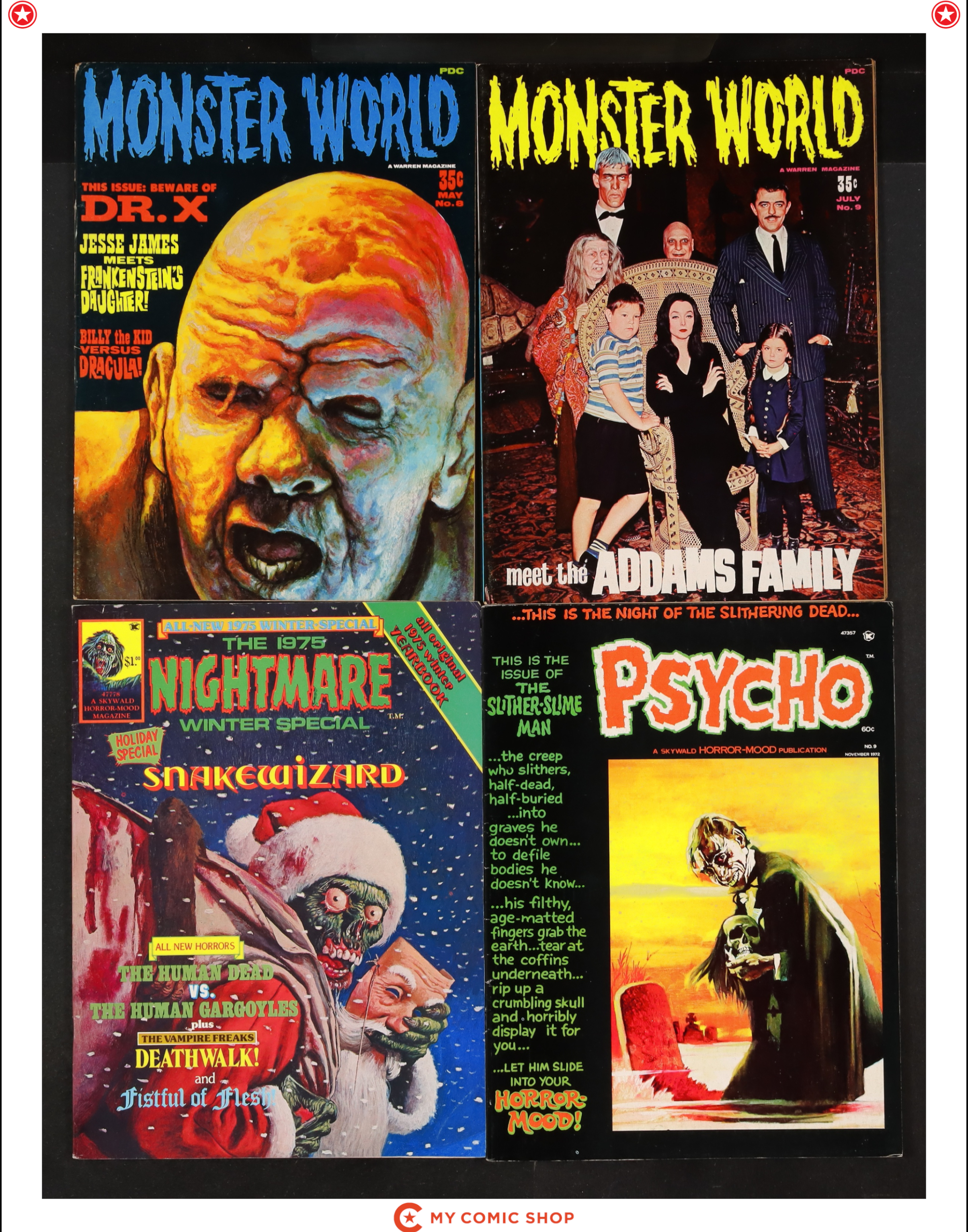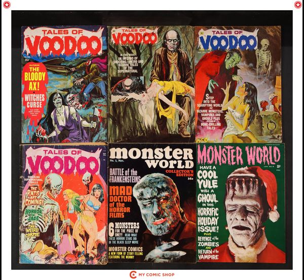 Issues Vol. 2 #3; Vol. 4 #5, #6; Vol. 7 #5 of Tales of Voodoo (1968); 1, 6, 8, 9 of Monster World (1964 Warren Magazine); Nightmare (1970 SkyWald) 23; and Psycho (1971-1975 Skywald) 9. Most will grade in the GD/VG to FN range, with Vol. 7 #5 grading at FR/GD.