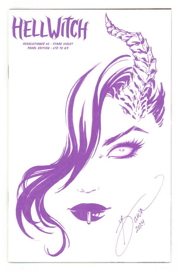 Stare Violet Pearl Edition Cover by Dawn McTeigue - Limited to 69 copies. Written by Mike MacLean and Brian Pulido. Art by Diego Bernard. Hellwitch is on a collision course with one of the most lethal half-devils in all of Hell - the sorceress assassin LADY SATANUS! Can Hellwitch prevail in their bone-crushing, spell-casting battle, or will Lady Satanus pound Hellwitch into submission? Who will reign supreme? Squarebound, 52 pages, full color, mature readers.