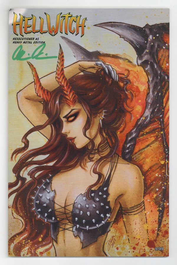 Heavy Metal Edition Cover by Dawn McTeigue - Limited to 99 copies. Written by Mike MacLean and Brian Pulido. Art by Diego Bernard. Hellwitch is on a collision course with one of the most lethal half-devils in all of Hell - the sorceress assassin LADY SATANUS! Can Hellwitch prevail in their bone-crushing, spell-casting battle, or will Lady Satanus pound Hellwitch into submission? Who will reign supreme? Squarebound, 52 pages, full color, mature readers. NOTE: Generic image is of a signed copy, this does not necessarily reflect all copies.