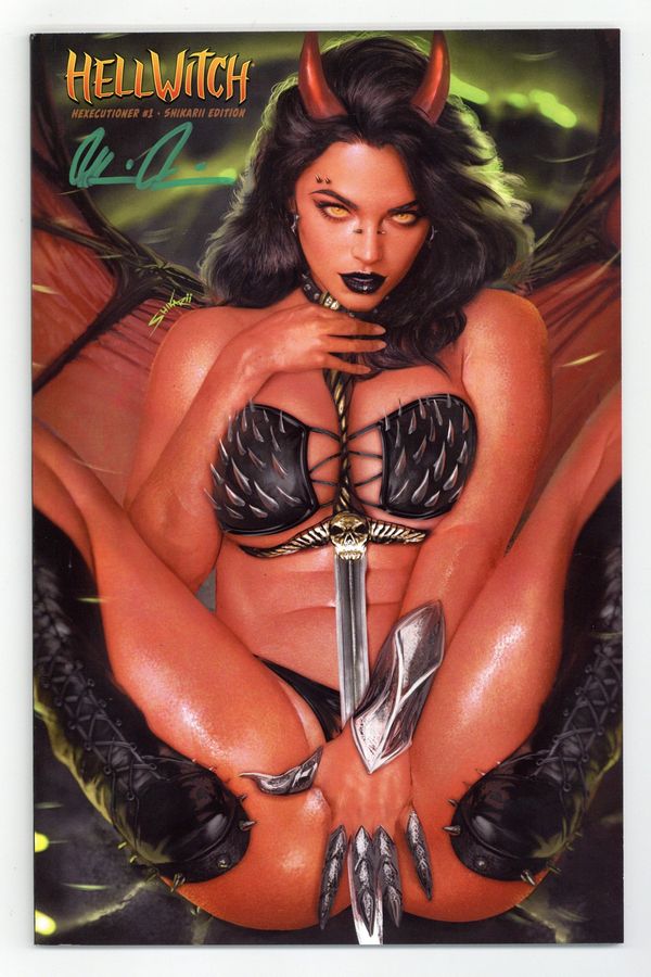 Shikarii Risque Glow-In-The-Dark Metallic Edition Cover by Shikarii - Limited to 15 copies. Written by Mike MacLean and Brian Pulido. Art by Diego Bernard. Hellwitch is on a collision course with one of the most lethal half-devils in all of Hell - the sorceress assassin LADY SATANUS! Can Hellwitch prevail in their bone-crushing, spell-casting battle, or will Lady Satanus pound Hellwitch into submission? Who will reign supreme? Squarebound, 52 pages, full color, mature readers.