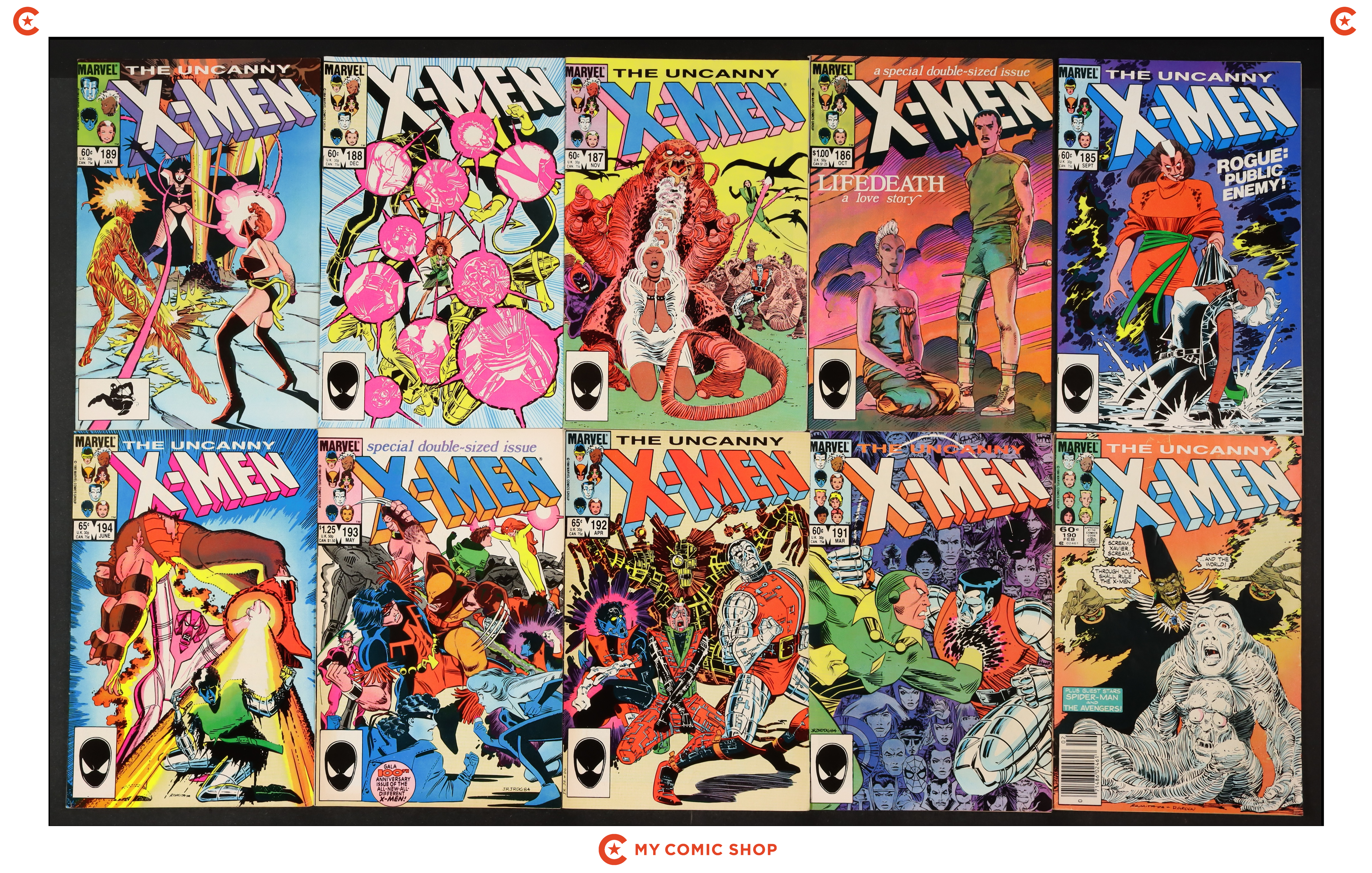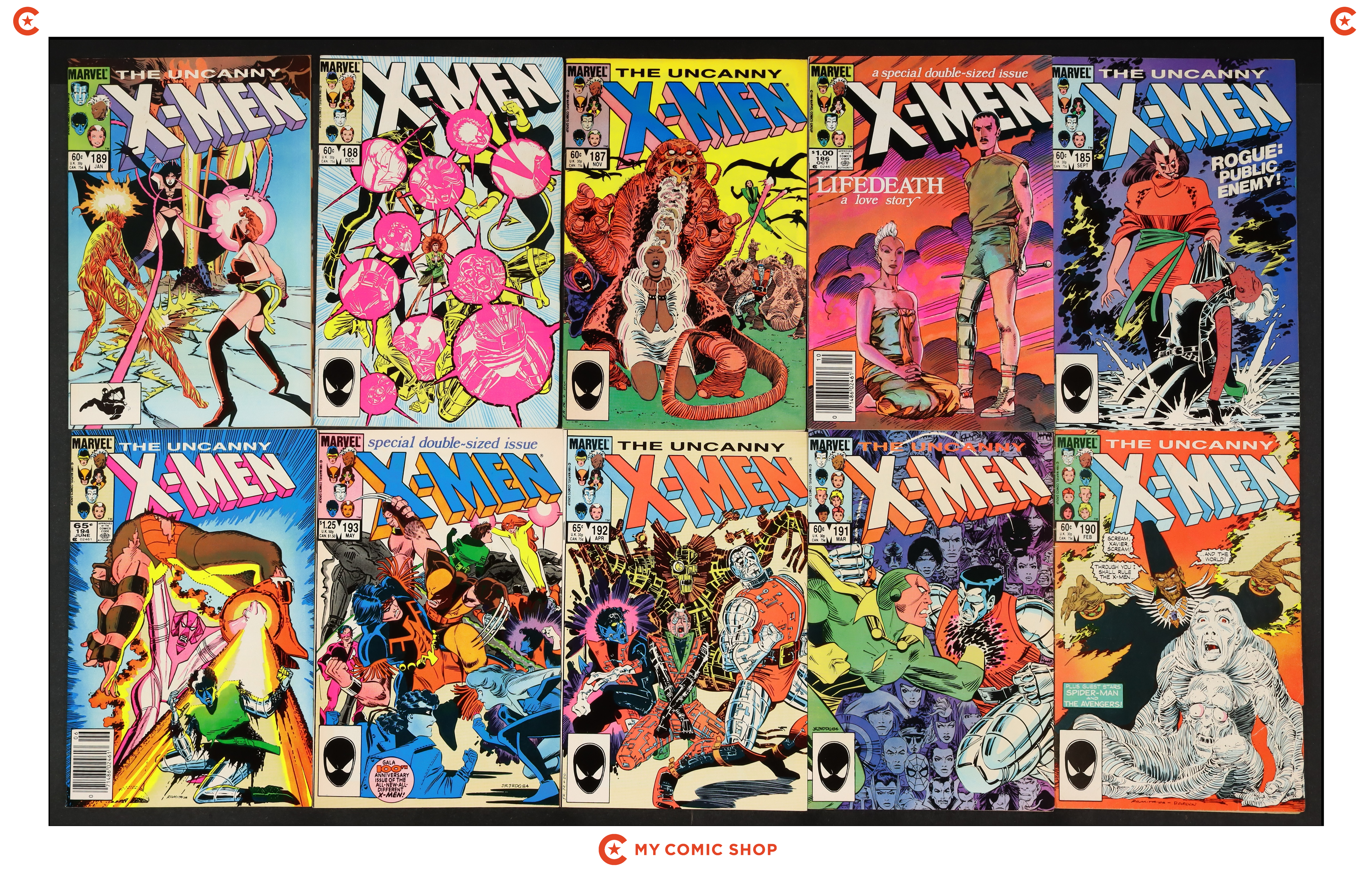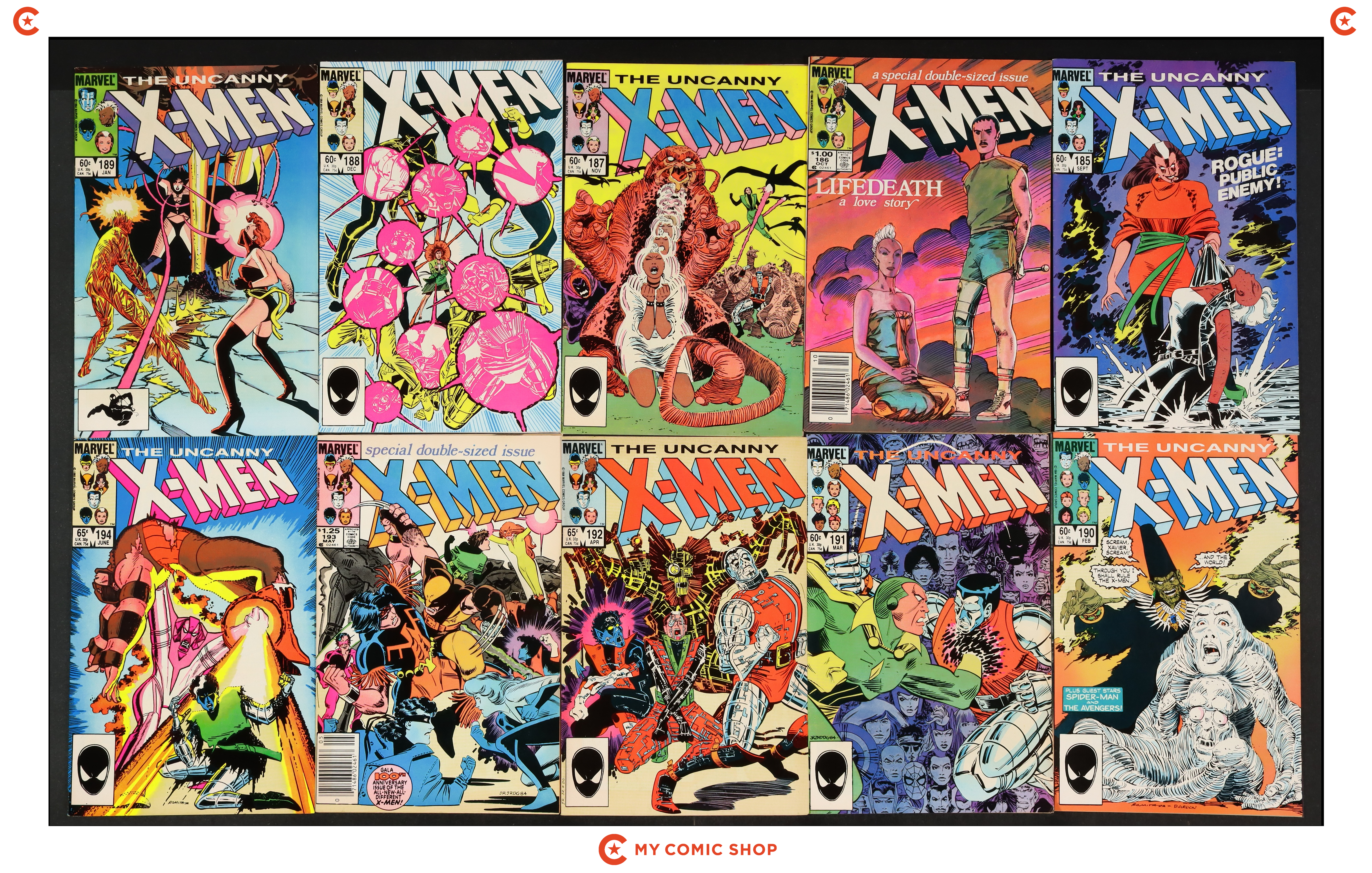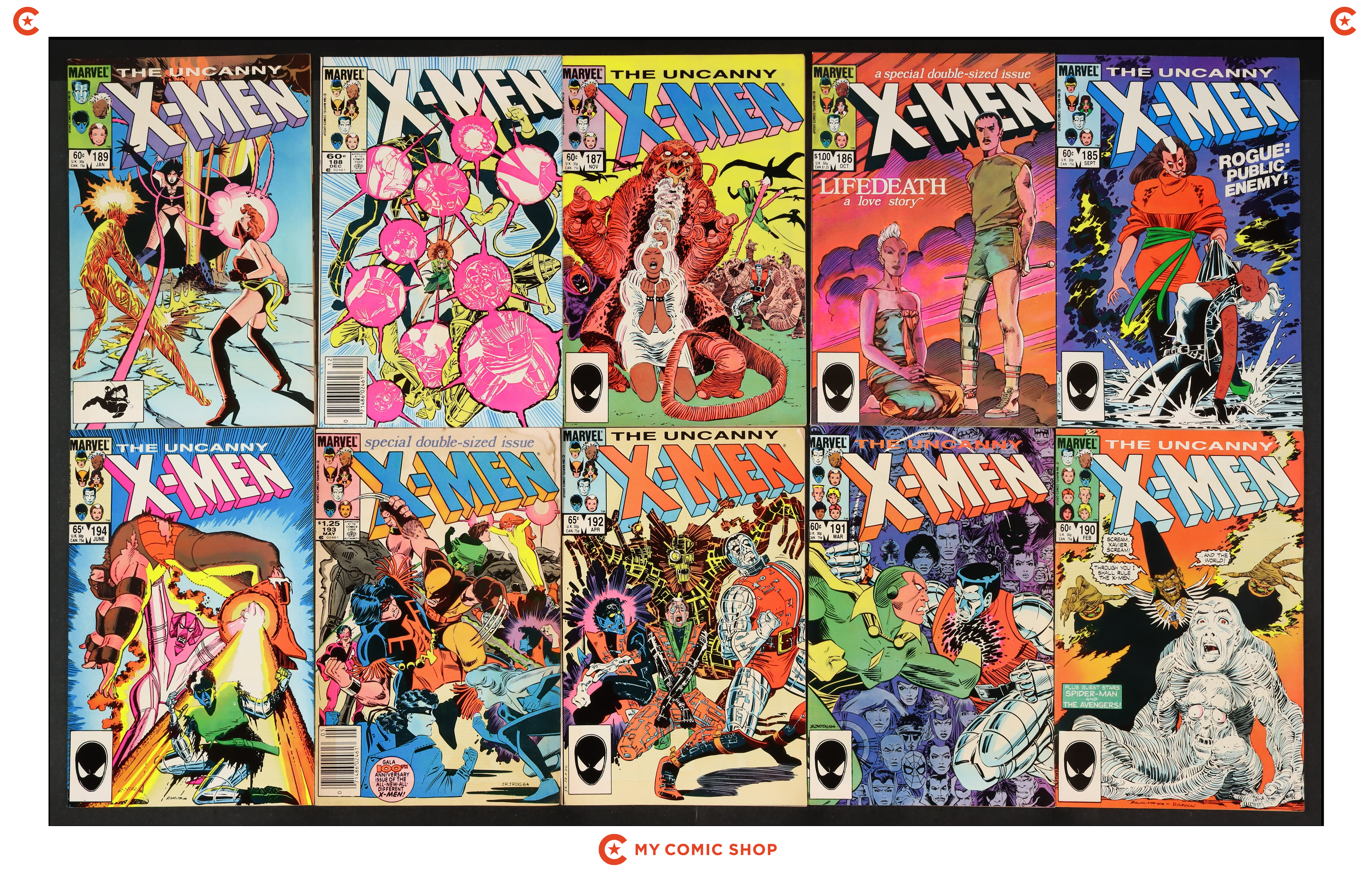 Issues 185D, 186D, 187D, 188N, 189D, 190D, 191D, 192D, 193N, and 194 of Uncanny X-Men (1963 1st Series). Most will grade in the FN to VF range with 193N grading GD.