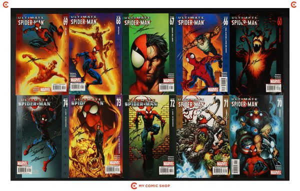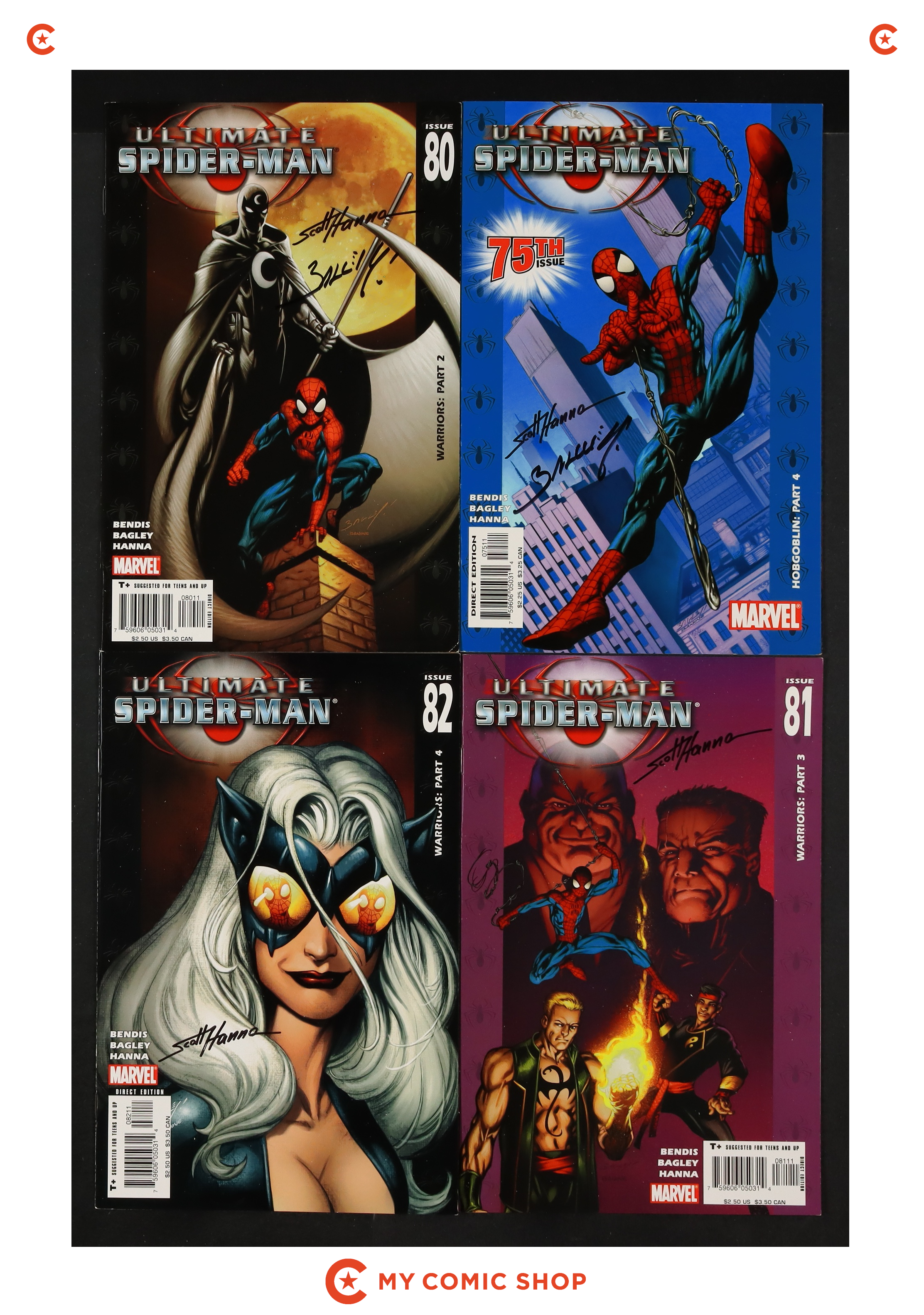Issues 60, 66-75, 80-82 of Ultimate Spider-Man (2000 Marvel) with issues 60, 66-69, 81, 82 signed by Scott Hanna, and 70-75, 80 signed by Mark Bagley and Hanna. No autograph certification is included. Most will grade in the VG to FN range.