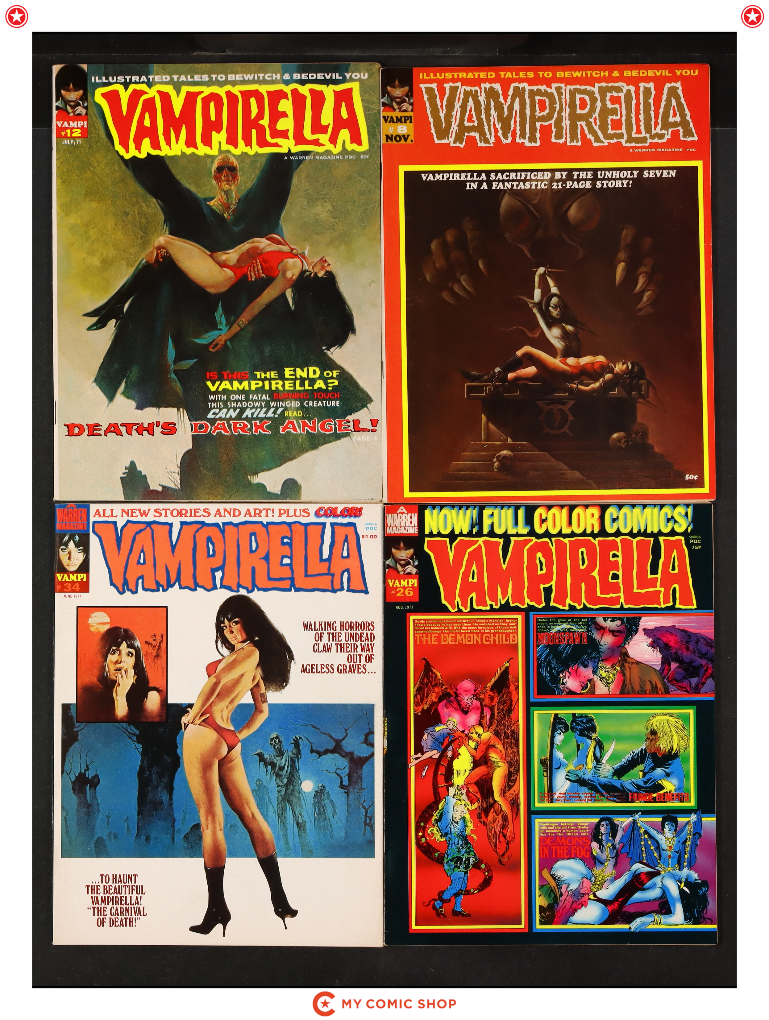 Issues 8, 12, 26, and 34 of Vampirella (1969 Warren). Most will grade in the FN+ range.