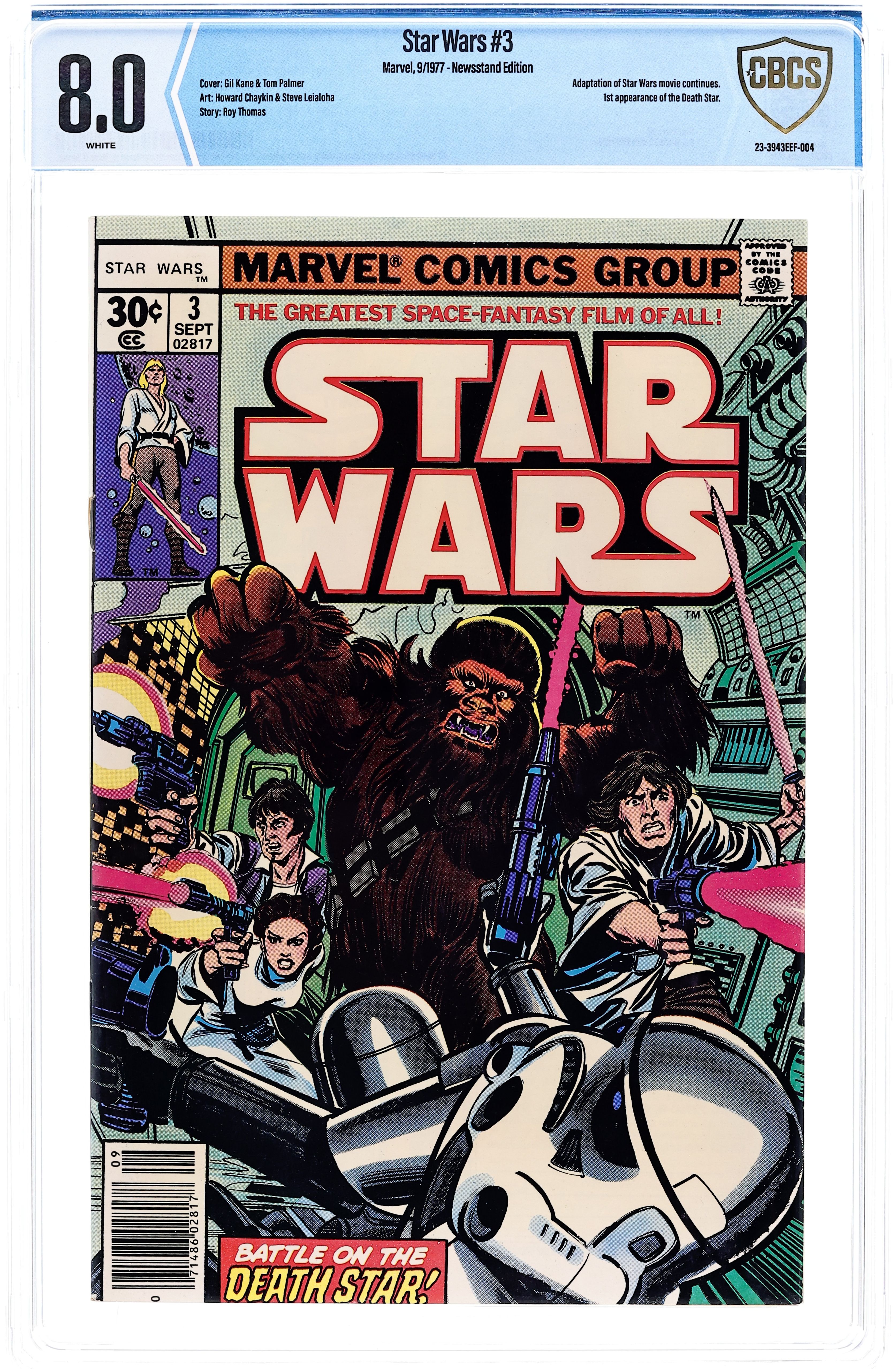 Starts Feb 2 1st printing, standard 30 Cent Newsstand Edition with UPC. A New Hope: Part 3 of 6. "Death Star!" Based on the screenplay by George Lucas. Adapted by Roy Thomas. Art by Howard Chaykin and Steve Leialoha. The evil Galactic Empire tests its ultimate weapon on Princess Leia's homeworld with devastating results. Meanwhile, Ben Kenobi begins Luke Skywalker's training in the ways of the force. However things take a turn for the worse when the Millennium Falcon is captured within the unrelenting grasp of the Death Star's tractor-beam. Now, it's up to this small motley band of heroes to mount a daring rescue attempt of the Princess from within the very bowels of the Empire's most powerful weapon. Cover price $0.30.