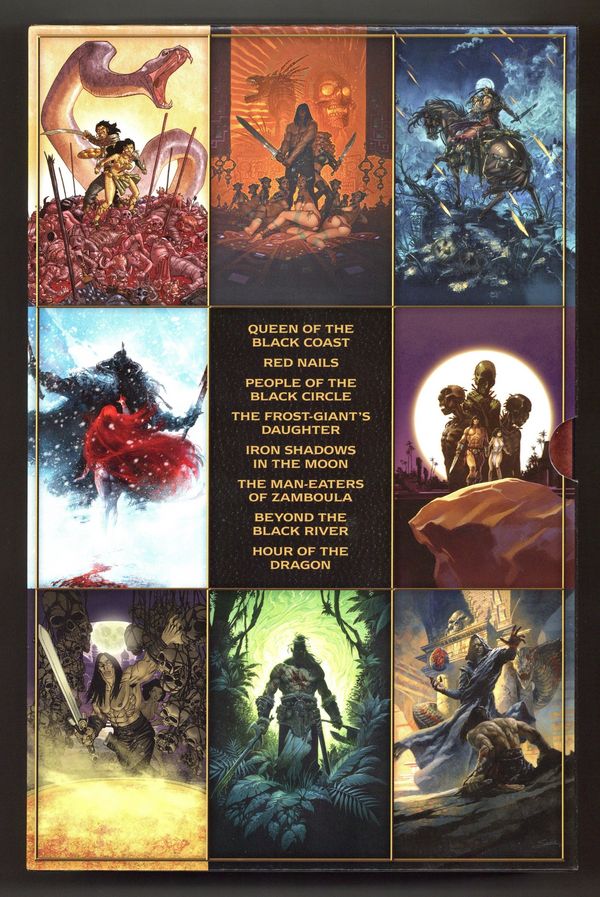 Starts Feb 23 Includes Vol. 1-4- Printings May Vary. Based on the stories by Robert E. Howard. Adapted by Jean-David Morvan and Regis Hautiere. Art by Pierre Alary, Olivier Vatine, and Didier Cassegrain. Cover by Pierre Alary and Didier Cassegrain. Back Cover by Kendrick Lim. ABLAZE is proud to present its bestselling line of UNCENSORED Robert E. Howard Cimmerian graphic novels, now available in a handsome slipcase box edition, collecting Volumes 1-4. Each Cimmerian volume contains two complete Conan stories, plus bonus material, including the original prose stories, in one epic hardcover collection! Plus a bonus folded poster!" VOL 1 - Featuring "QUEEN OF THE BLACK COAST" & "RED NAILS"" VOL 2 - Featuring "PEOPLE OF THE BLACK CIRCLE" & "THE FROST-GIANT'S DAUGHTER"" VOL 3 - Featuring "IRON SHADOWS IN THE MOON" & "THE MAN-EATERS OF ZAMBOULA"" VOL 4 - Featuring "BEYOND THE BLACK RIVER" & "HOUR OF THE DRAGON"Discover the true Conan, unrestrained, violent, and sexual. Read the stories as he intended! Hardcover (4 Volumes with Slipcase), 656 pages (Total), full color. Mature Readers Cover price $90.00.
