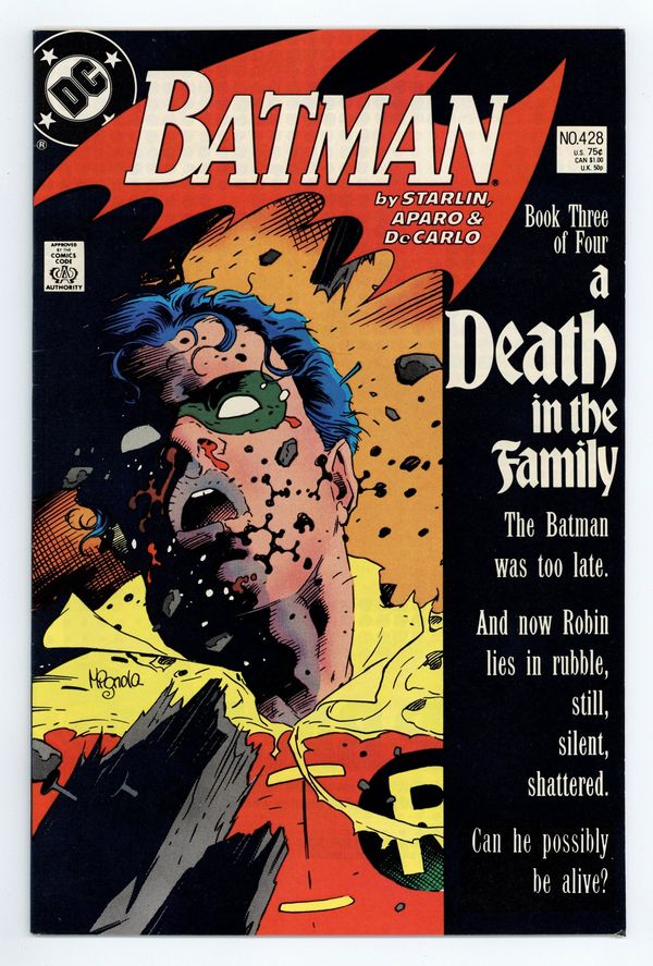 Starts Mar 23 First printing. Direct Edition. Cover art by Mike Mignola. "A Death in the Family" part 3 of 4, script by Jim Starlin, pencils by Jim Aparo, inks by Mike DeCarlo; Death of Sheila Haywood; Burial of Sheila Haywood and Jason Todd; The Joker becomes the Iranian Ambassador to the U.N. Results of Phone Poll as to whether Robin dies this issue or not. NOTE: Most issues from 397-432 were reprinted in 1989 and sold in multipacks. These 2nd and 3rd prints have back cover ads dated 1989. 36 Pages, Full Color. Cover price $0.75.