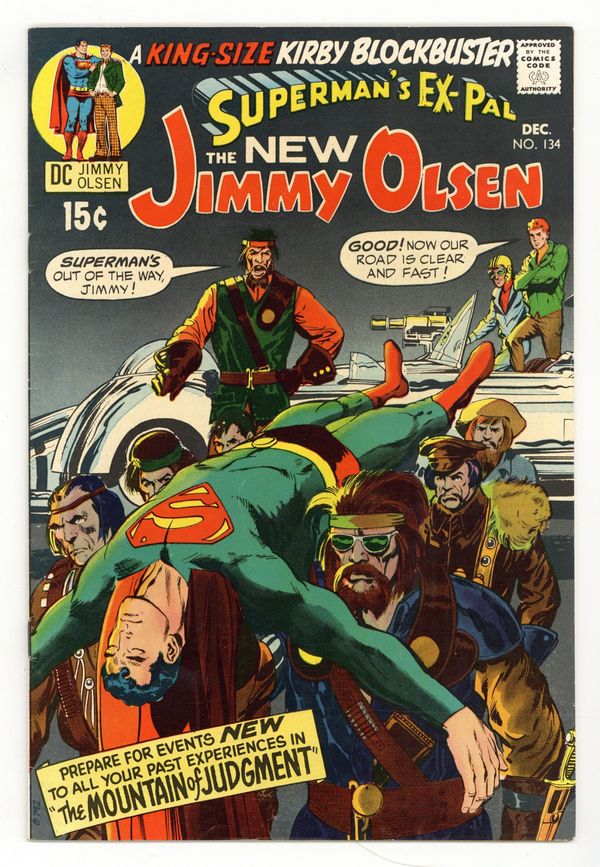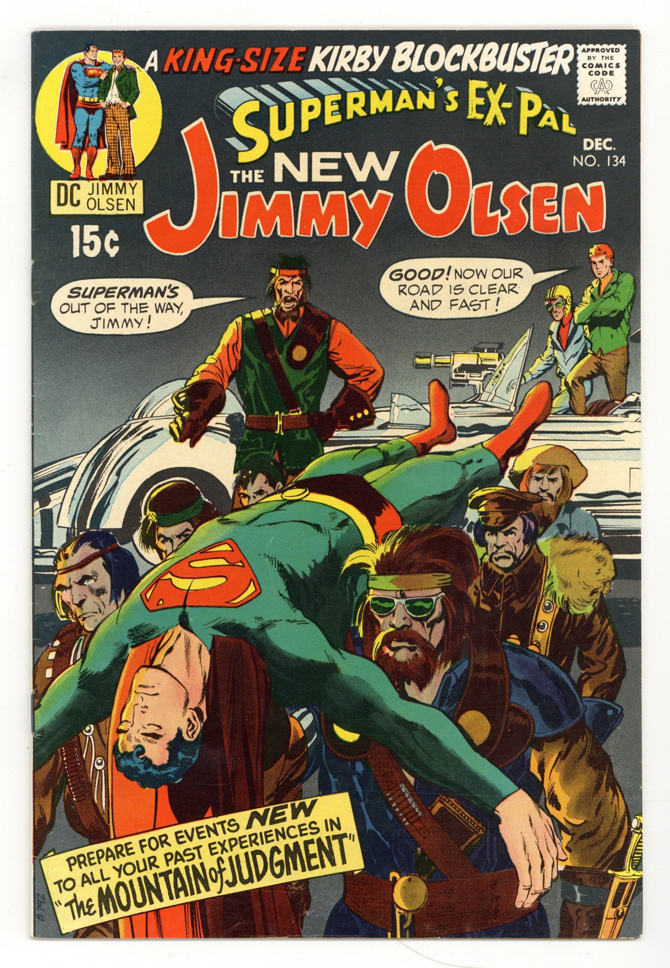 Starts Jan 3 1st appearance of Darkseid (cameo). Cover art by Neal Adams. The Mountain of Judgement!, script by Jack Kirby, pencils by Jack Kirby and Al Plastino (some Superman heads), inks by Vince Colletta; Superman defuses a bomb that was intended to destroy the Hairies, Jimmy, and the Newsboys. The Whiz Wagons Are Coming!, script by Jack Kirby, pencils by Jack Kirby, inks by Vince Colletta. 36 Pages, Full Color. Cover price $0.15.