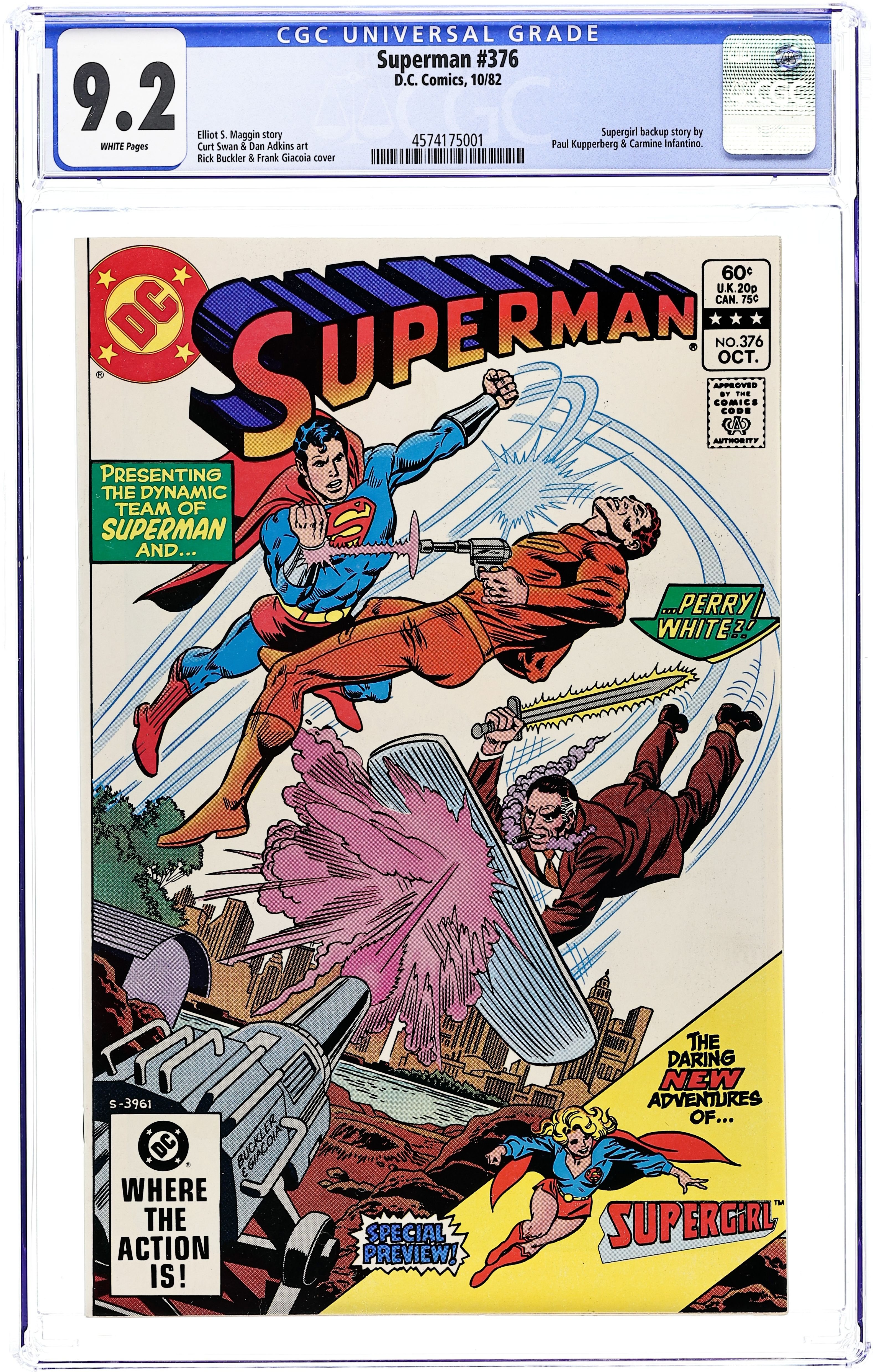 Starts May 25 Cover pencils by Rich Buckler, inks by Frank Giacoia. The Ozone-Master Comes Calling!, script by Elliot S! Maggin, pencils by Curt Swan, inks by Dan Adkins; Perry White helps Superman stop the Ozone-Master. Untitled Supergirl story, script by Paul Kupperberg, pencils by Carmine Infantino, inks by Bob Oksner; Supergirl helps Superman stop a tornado and tells him of the changes she is going to make in her life; story continued between SUPERMAN FAMILY #222/DARING NEW ADVENTURES OF SUPERGIRL #1. 36 Pages, Full Color. Cover price $0.60.