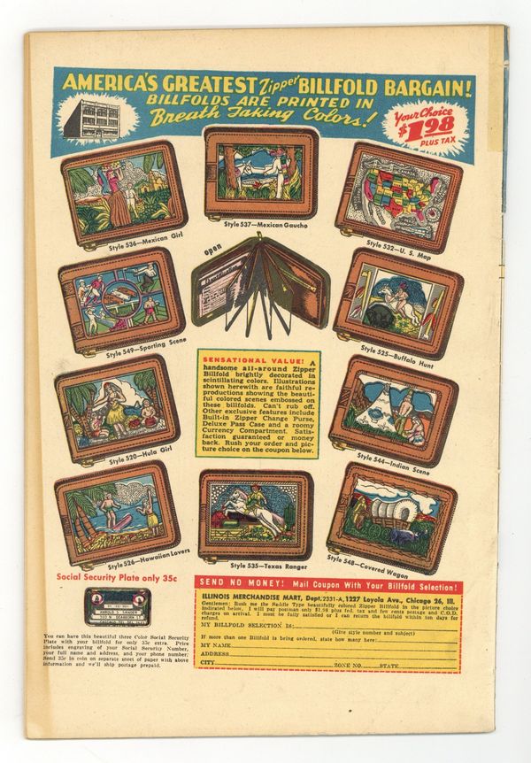 Ends Apr 13 7:25 PM CST Bid History 7 bids Current Bid $62 Your Secret Max Bid If you'd like to bid, please log in or register. Cover pencils by Jim Mooney, inks by Charles Paris. "Gamble With Doom!", art by Jim Mooney (as Bob Kane); The Joker becomes passionate about gambling, but ordinary stakes won't satisfy him; The stakes with death to the loser involves Batman and Robin. "Born For Adventure!", script by Bill Finger, art by Jim Mooney; Batman and Robin team with an archeologist to track an international thief called the Globetrotter, who has come to Gotham City. "Strange Territory" text story by M. G. Pattington. "The First American Detective!", art by Jim Mooney; To solve the mystery surrounding his ancestor Silas Wayne, Bruce Wayne has Professor Nichols send him into the past; When Batman and Robin arrive in 1787, they stop a gang of highwaymen and encounter Franklin, who frees them. 52 Pages, Full Color. Cover price $0.10.