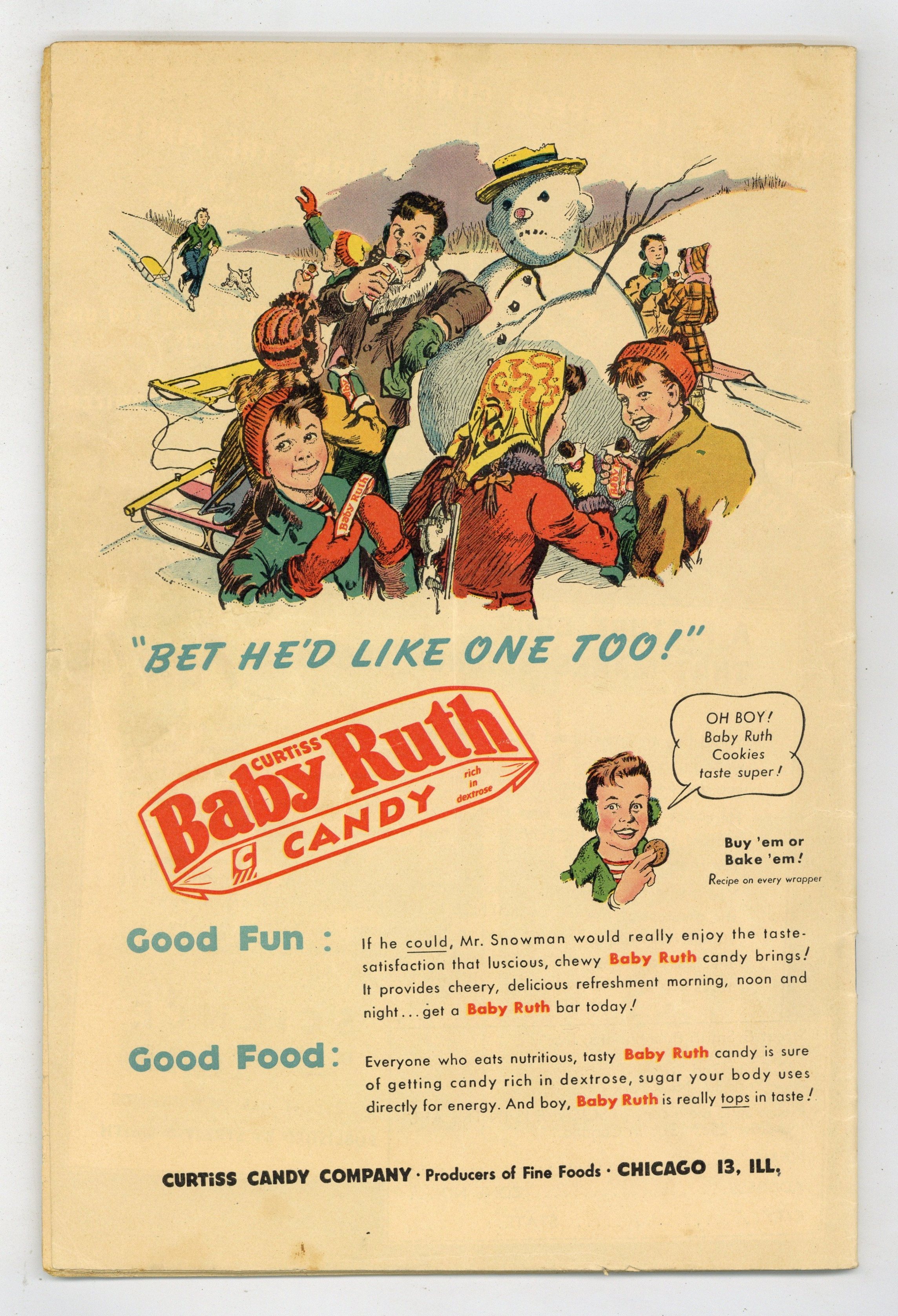 Starts Jan 3 Cover art by Kurt Schaffenberger. The Doubting Thomas Doubter, art by Kurt Schaffenberger; Thomas Doubter temporarily gains Captain Marvel, Jr.'s powers. Wheaties comic-style ad wioth Vern Stephens. Nature's Murderer! starring Nyoka the Jungle Girl; After the death of his father, young Steve Hagen inherits the entire estate, overseen in trust by his Uncle Michael; However, greedy Michael suggests to the lad that a hunting trip in the jungle would be just the thing to lift the boy's spirits, the Uncle believing that "accidents" do happen in the jungle. The Babe Ruth Story Tootsie Roll ad with Captain Tootsie, art by C. C. Beck. Dressed to Kill! starring Bulletman, art by Bill Ward. Employment Escapade starring Colonel Corn and Korny Kobb. Suspected starring Tom Mix, pencils by Carl Pfeufer, inks by John Jordan. Two Comix Cards featuring Monte Hale. 52 Pages, Full Color. Cover price $0.10.
