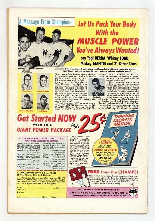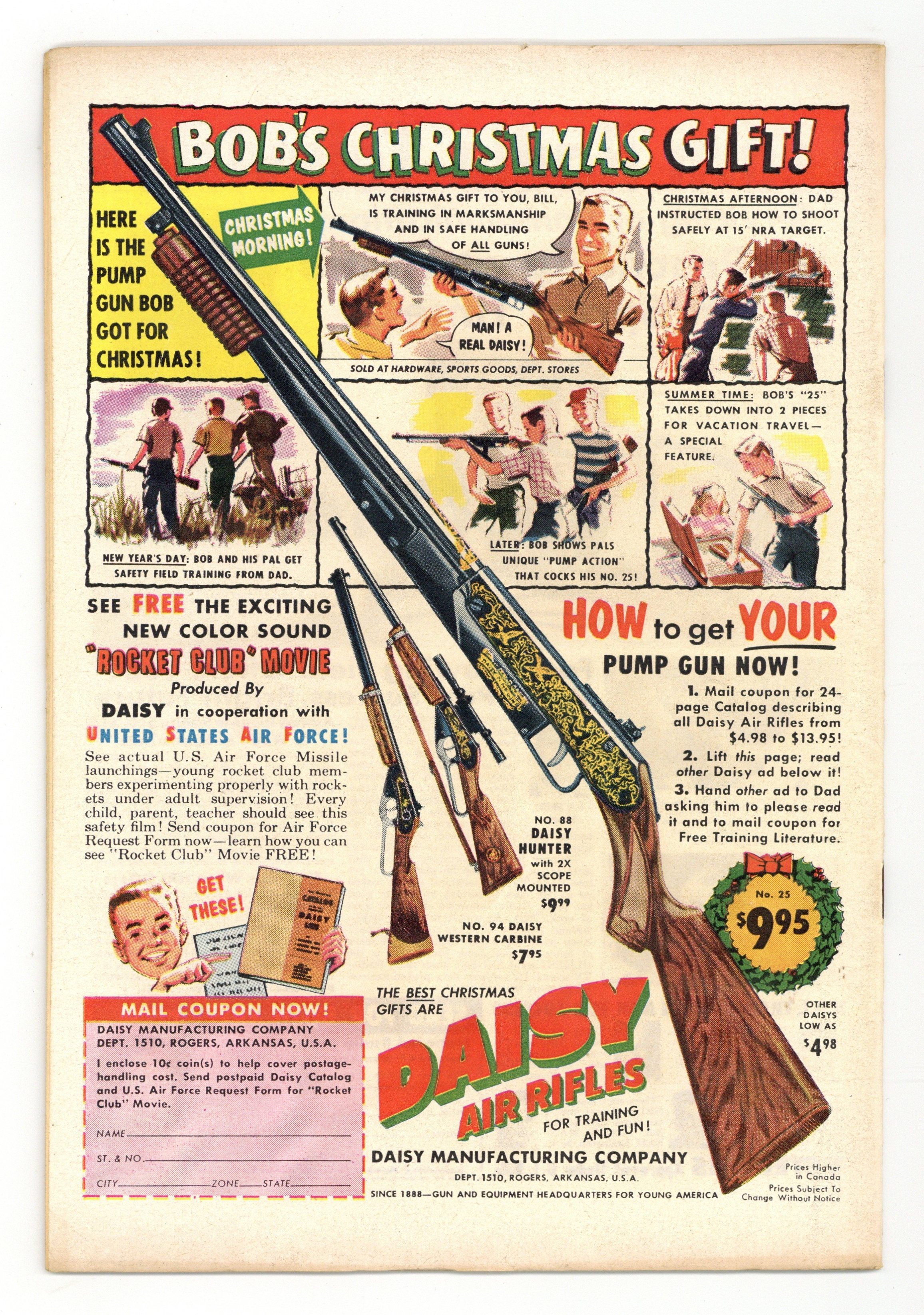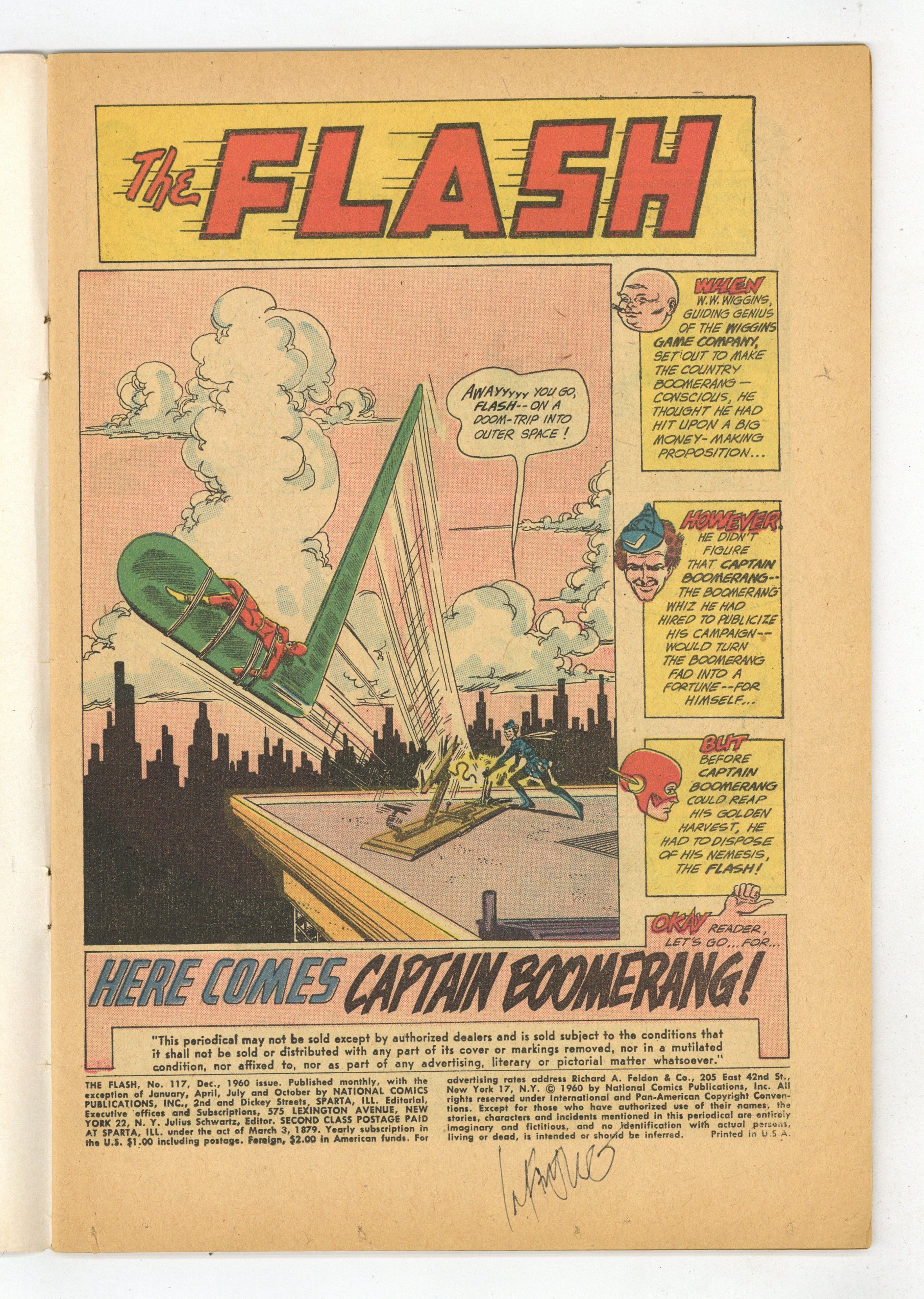 Starts Jan 3 Cover pencils by Carmine Infantino, inks by Joe Giella. First appearance of Captain Boomerang in Here Comes Captain Boomerang!, script by John Broome, pencils by Carmine Infantino, inks by Murphy Anderson; W.W. Wiggins, the head of a game company, hires Digger Harkness to be his boomerang expert; Harkness becomes Captain Boomerang, commits crimes, and battles Flash. The Madcap Inventors of Central City!, script by Gardner Fox, pencils by Carmine Infantino, inks by Joe Giella; Winky, Blinky, and Noddy build a machine and start an inventing business. Letter to the editor from Fox himself! Ad for Giant Superman Annual. Comparative Speed Records fact page. Training Secrets Manual ad featuring Bob Cousy, Doak Walker, Carmen Basilio, and Kyle Rote. 36 Pages, Full Color. Cover price $0.10.